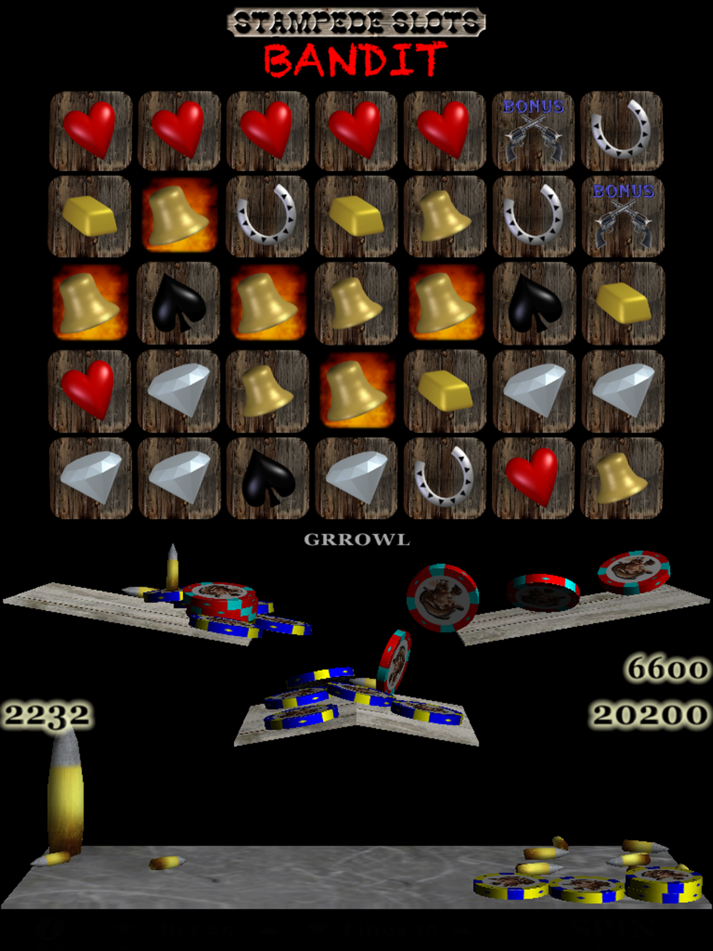 Gunslingers only please. In the wild west you really can beat the house. Traditional western themed slots, with a twist, you can shoot the symbols to win more, much more. Use your shots wisely, you have a limited number. Score bonus symbols to get more bullets, the count is at the lower left. Run completely out, and you must Spin again. Use your shooting skills to get to the top of the Game Center leader board. All winners are accompanied by corresponding cowgirl poker chips, watch them fall, or keep shooting. New bonus bullets fall too, aren't physics great. Don't be alarmed if chips and bullets disappear, the bank keeps tabs on your total, and adjusts accordingly. Different colored chips represent different values.
