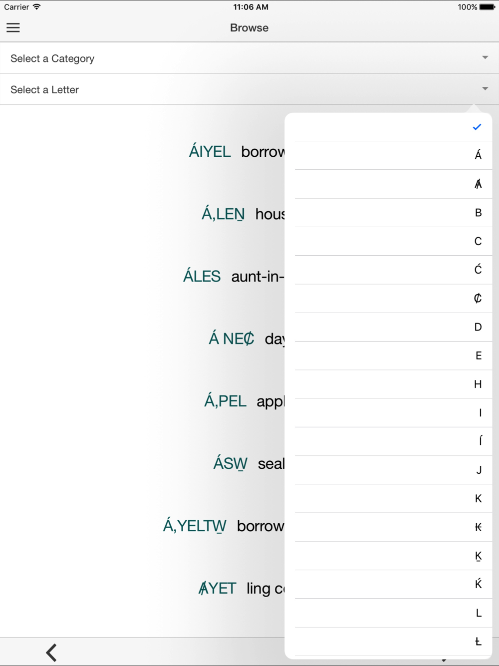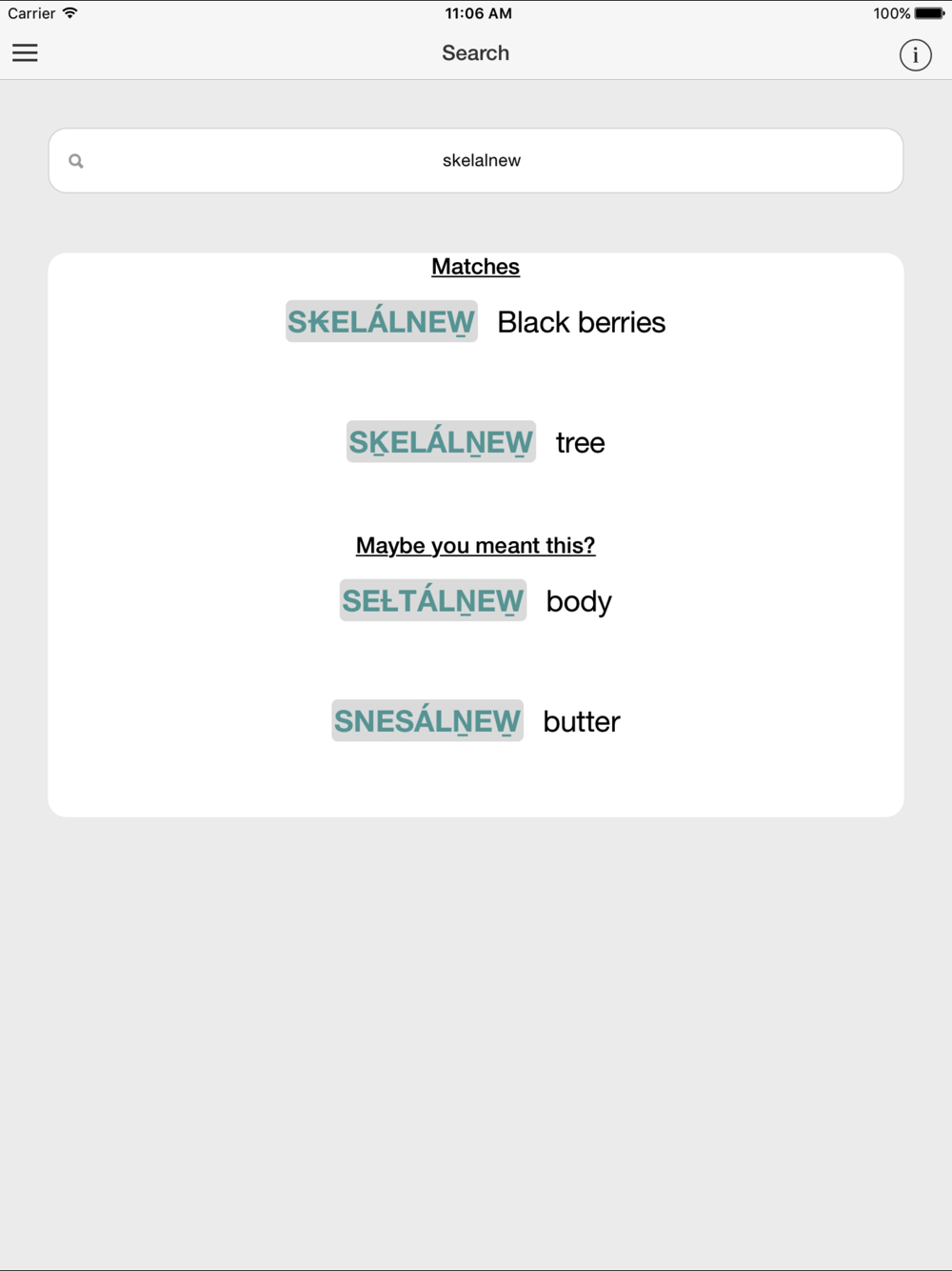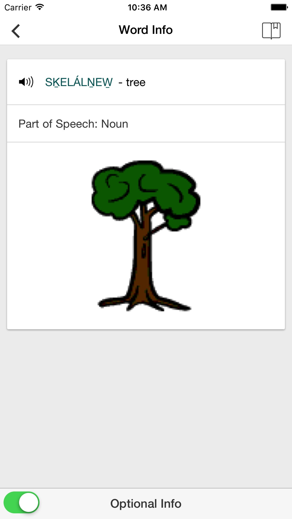 The SENĆOŦEN app is a media-rich bilingual dictionary and phrase collection comprised of words and phrases archived at the online Aboriginal language database FirstVoices.com. Word and phrase definitions are illustrated with audio recordings, images and videos. Editing features allow users to customize content by replacing default multimedia with personal pictures, videos and sounds using either the camera and microphone built into their device or images from their onboard photo collection.