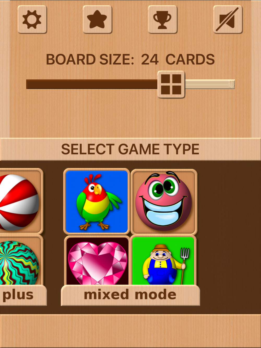 Depending from you needs and skills, the complexity of the memory matches game can be adjusted between 6, 12, 20, 24 and 30 cards. You can also select the type of the Memory Cards which will appears - there are 13 different card sets, plus mixed mode, where all card sets are mixed together.