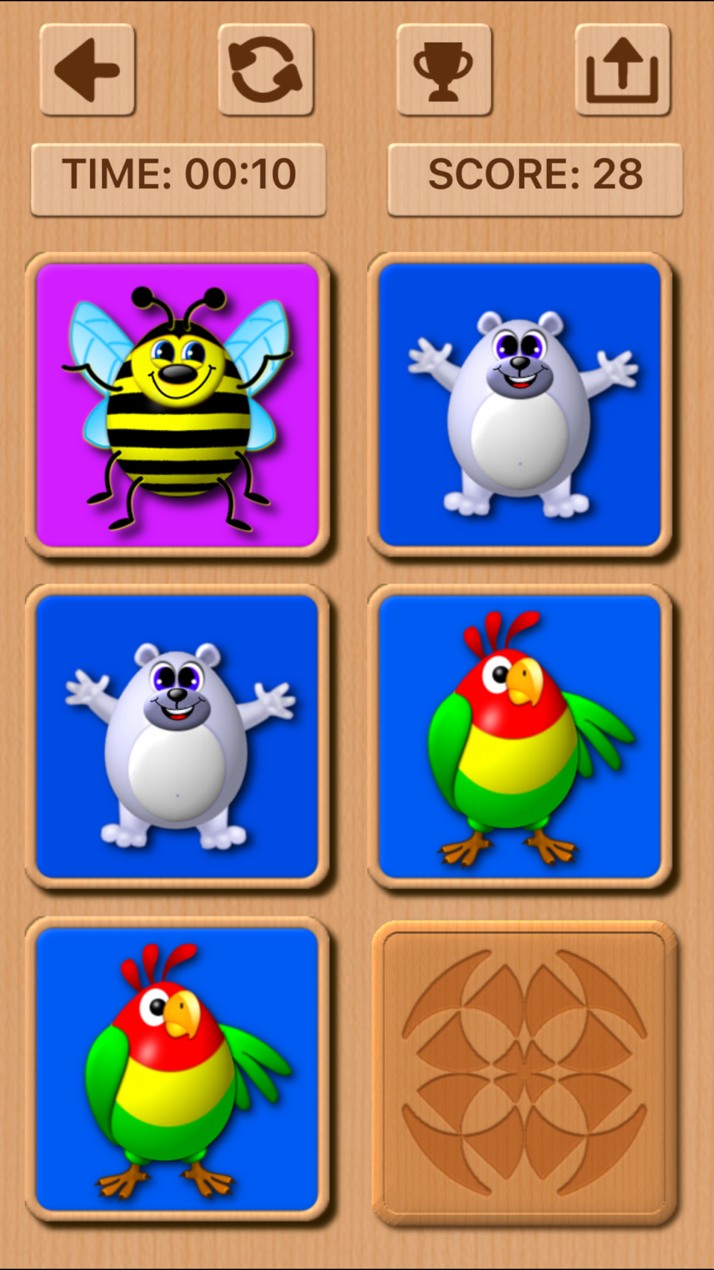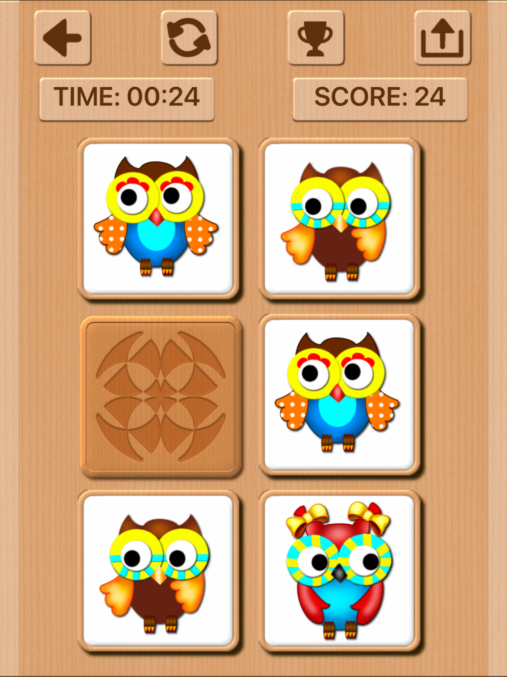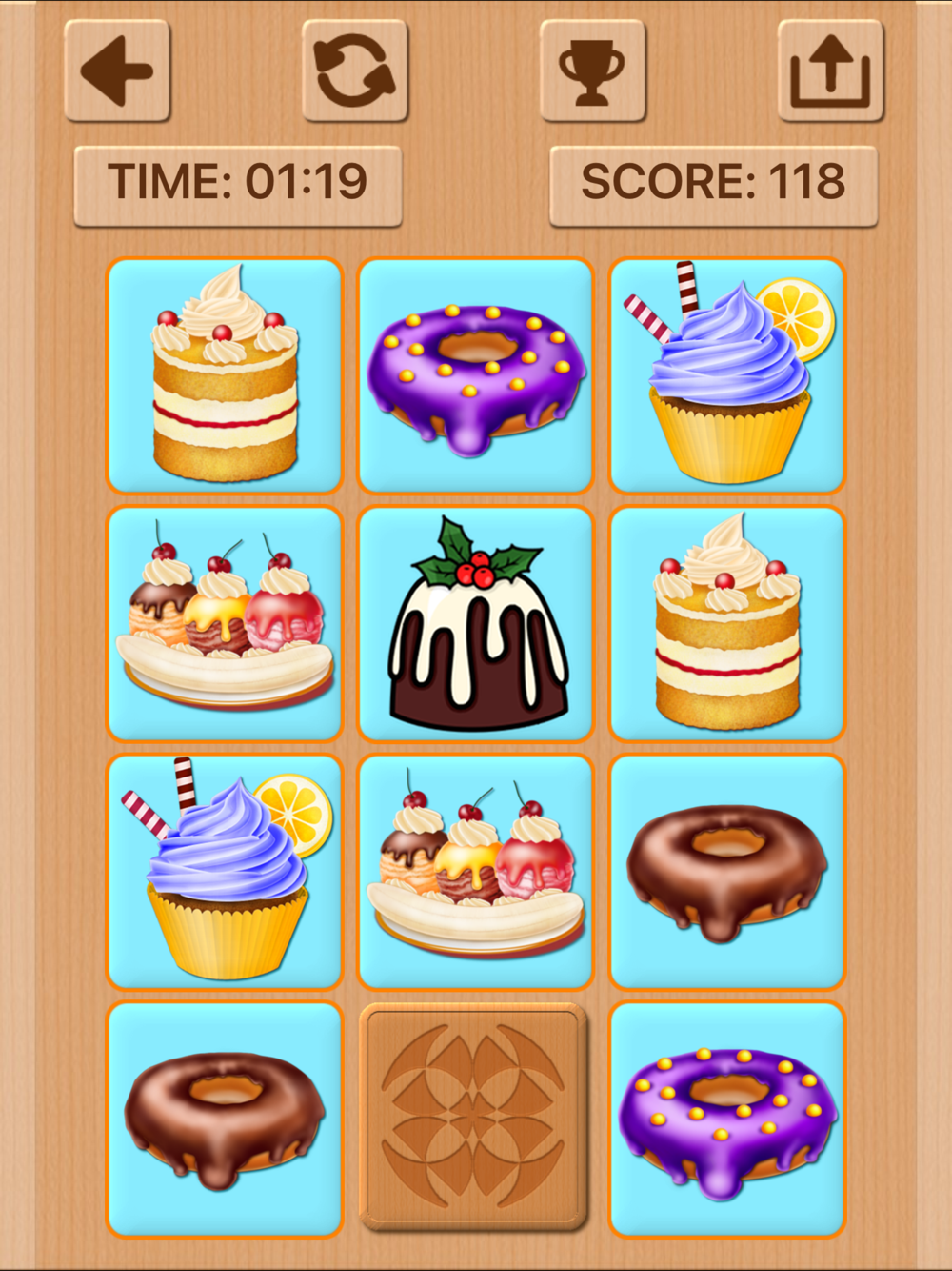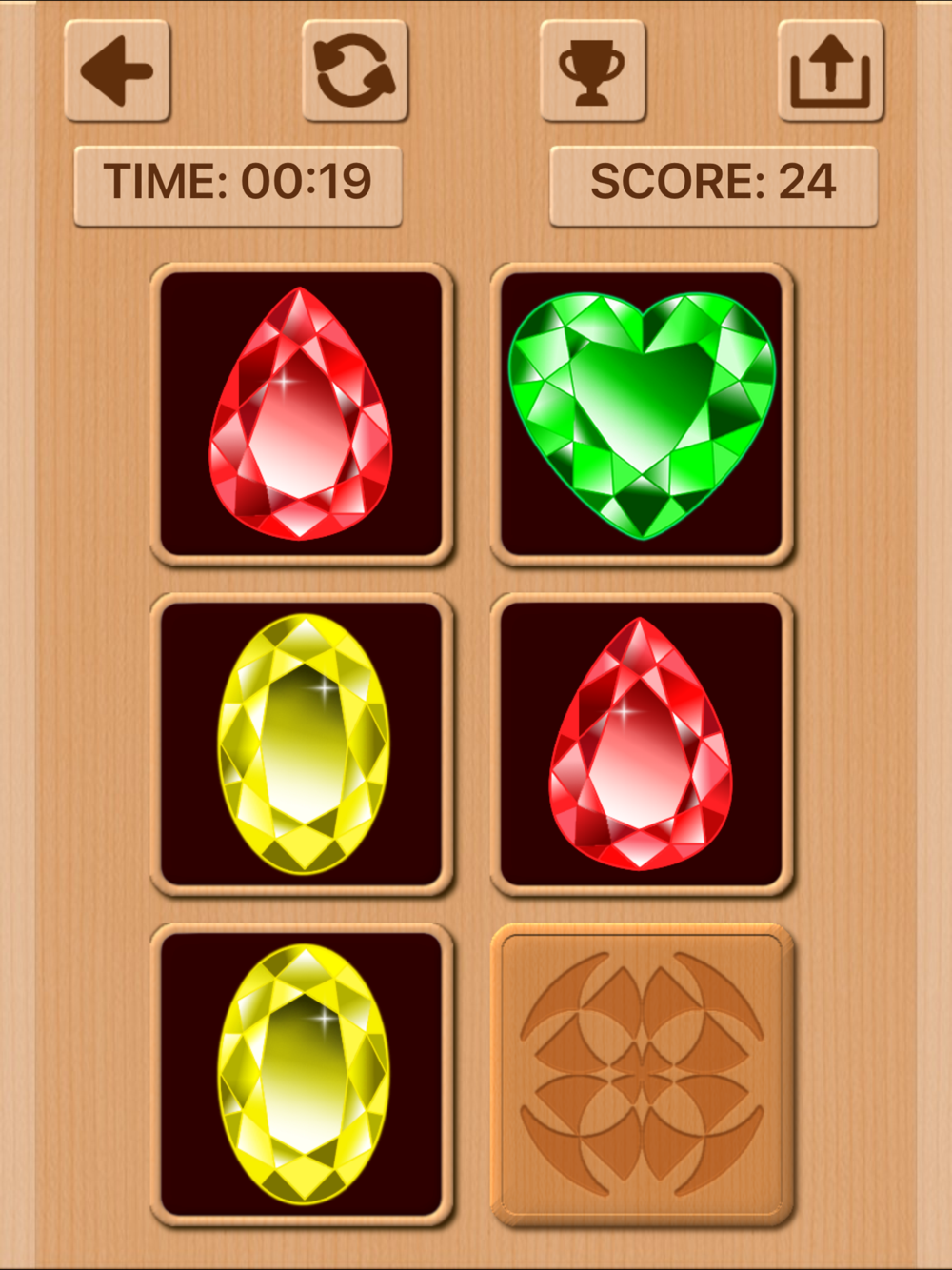 Initially you will see all memory cards turned face down. Tap on one of the card and remember the picture on it. With the next tap try to find and flip the card with the same picture as previous one. If pictures on the both cards will be the same they will stay opened and you can continue with the next pairs. Otherwise both cards will flip back over and you will get another try to match cards. Try to find all matching card pairs with less clicks and minimal time as possible to get higher score!