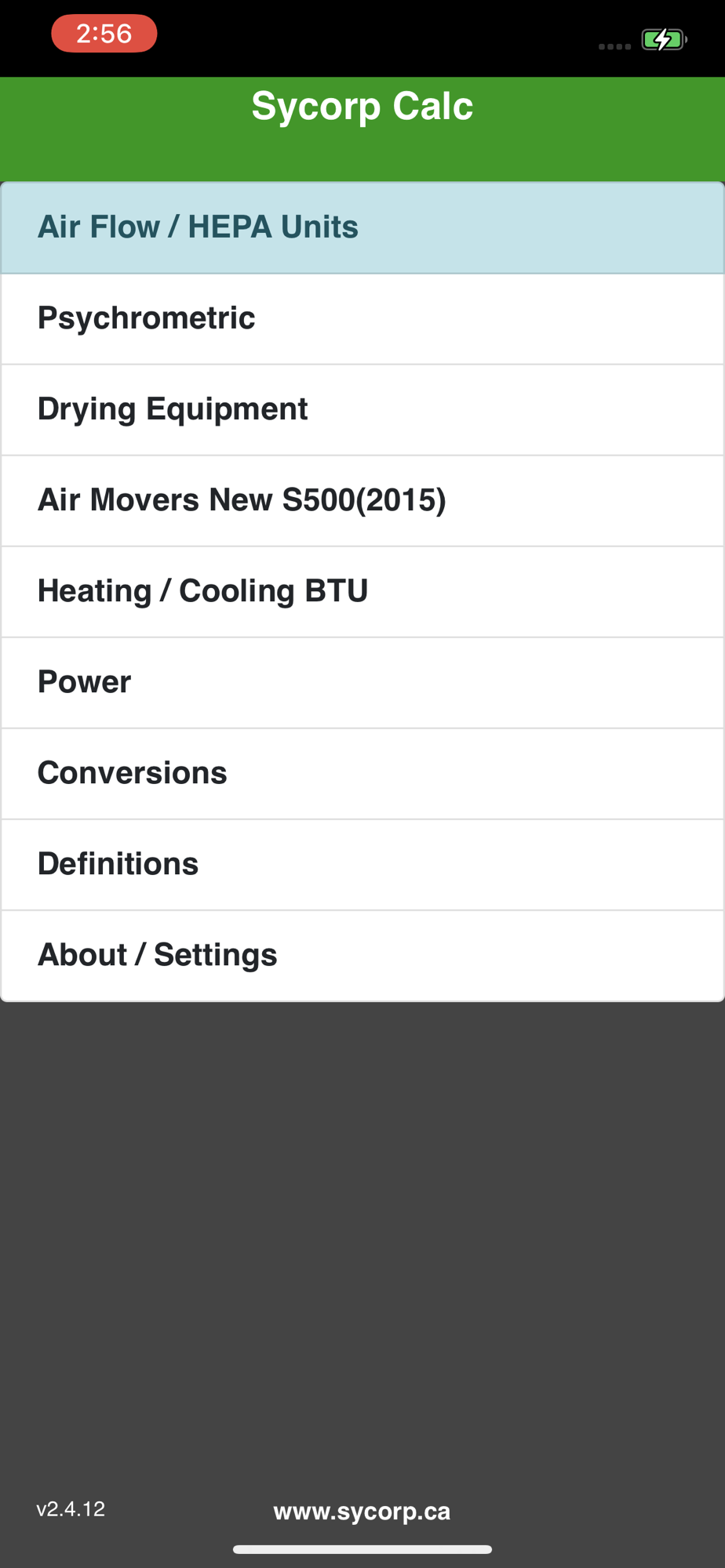 The Sycorp Calc app provides quick and easy access to a number of calculations used in Water Damage Restoration, Construction, HVAC and Indoor Air Quality industries. Easy to use, quick access for use on job sites. Great for water technicians, supervisors, and insurance adjusters. Based on IICRC formulas. Includes published specs on equipment from Dri-Eaz, Phoenix, Nikro, Jon Don, DryAir, B-Air, Viking, Santa Fe, Abatement and others.