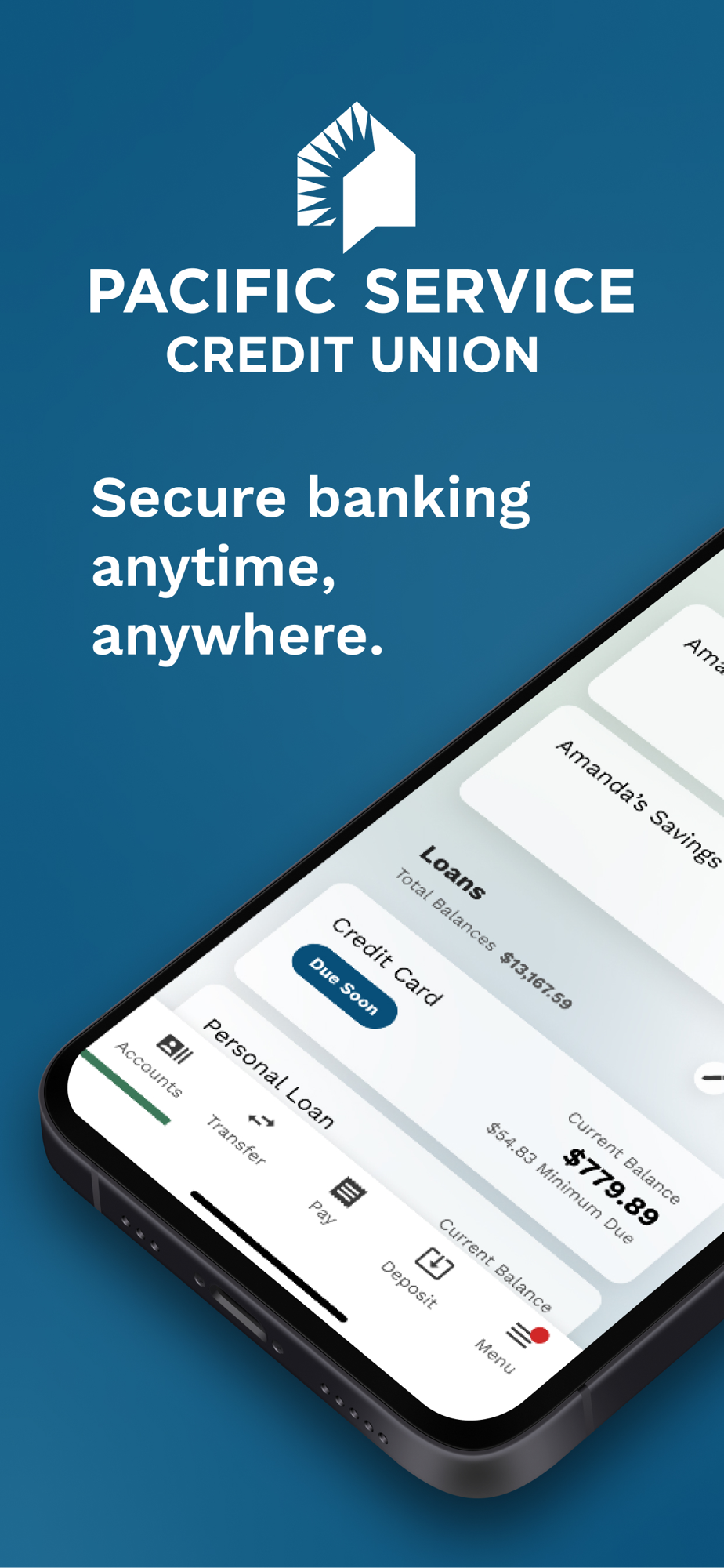 Welcome to Pacific Service CU mobile banking. With our mobile app, you can turn your smartphone into a mobile branch. With secure account access, you can verify balances, transfer money, deposit a check, or pay bills anytime from anywhere.