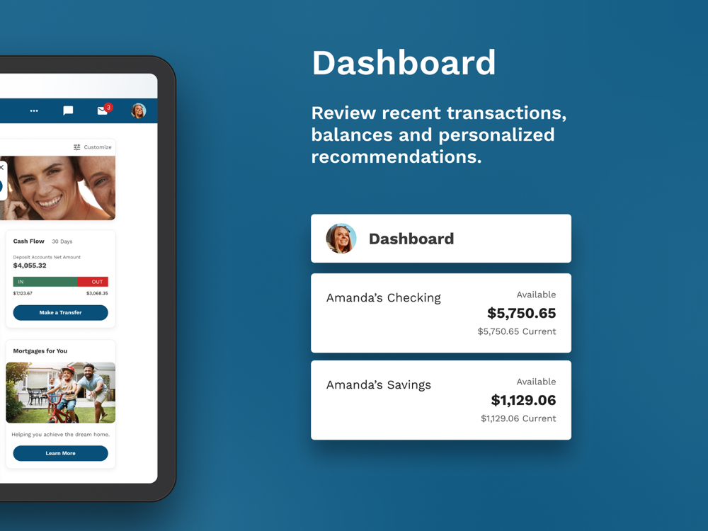 Dashboard – Manage all of your accounts on the dashboard. View available funds, the progress of savings goals, upcoming payments, deposits and more all on one screen.