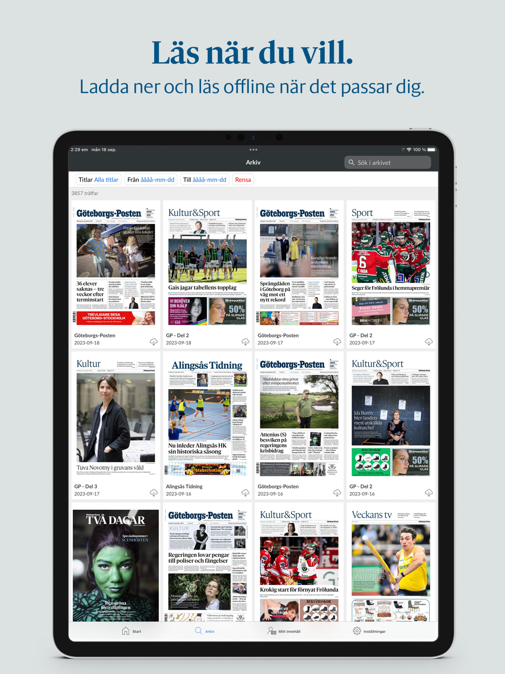 Med e-tidningen får du tillgång till all vår kvalitetsjournalistik, både från andra sidan jorden och runt hörnet. Läs alla reportage, granskningar och analyser i din mobil eller surfplatta, när och var du vill. Utöver tidningens delar får du även tillgång till alla ordinarie bilagor digitalt.