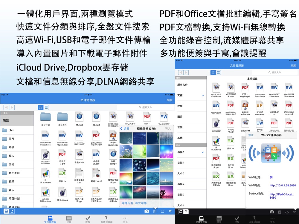 - 支持iCloud Drive,Dropbox雲存儲,uPnP(DLNA)方式網絡文件共享.您可以直接把雲端文件方便地與本地文檔交互,並支持雲端在線閱讀.