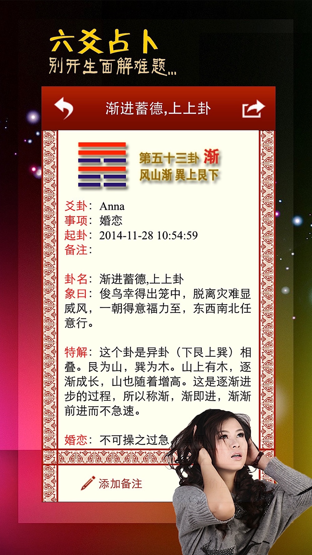 针对爻卦记录,卦友可在爻卦后自行添加备注信息,如具体针对某某事所占之卦。