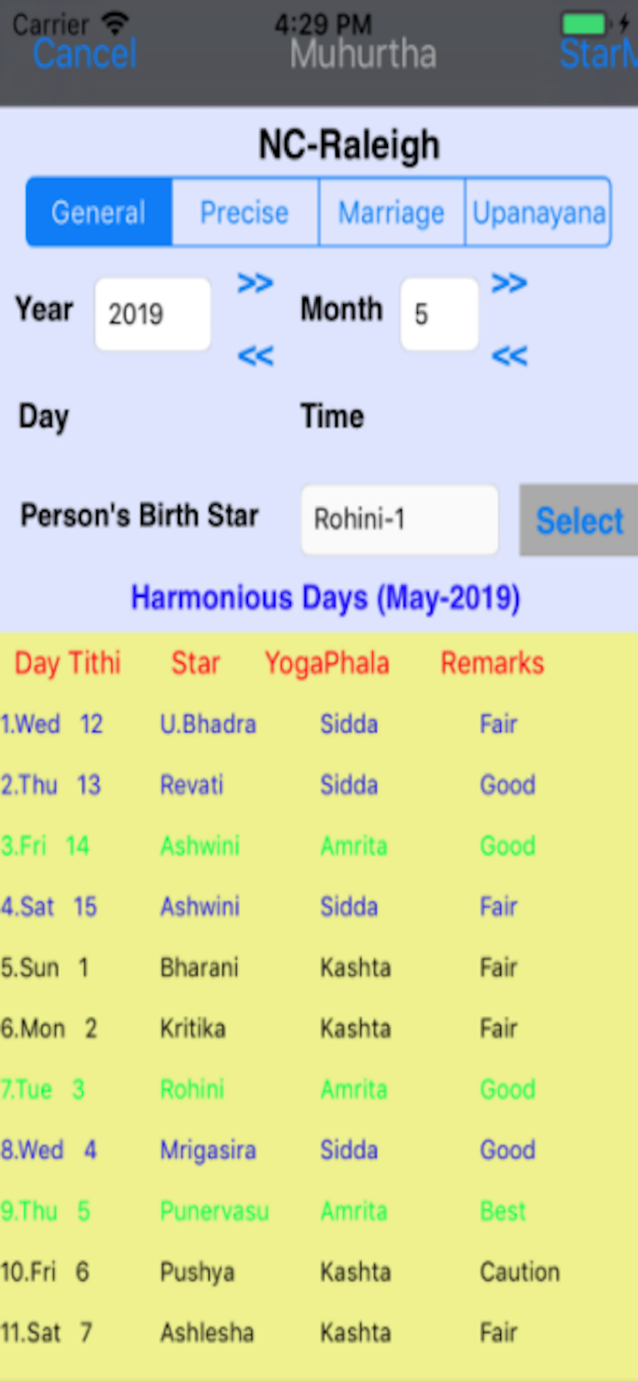 This is covered under major four categories i.e., General purpose, Precise, Marriage and Upanayana. App generates calendar of for the given year and month with almanac details. In general-purpose category, harmonious days are listed with its suitability with respect to an individual birth star and given in the remarks column. App notes has details on election criteria applied for both Marriage and Upanayana since there can be different versions possible with exceptions. This should help users to understand the difference between their respective local traditions and rules applied in this app.