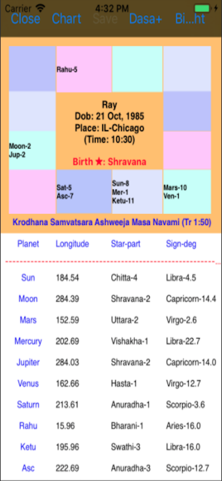 By default, it gives the traditional chart with zodiacal details in terms of its longitude and position with respect to different constellations for the date selected on the home screen. Therefore one can navigate the home screen to set any day in the current year to obtain the day’s chart. Chart type button is provided in the toolbar to quickly switch between chart formats from south Indian to north Indian style as shown in the screen shots.