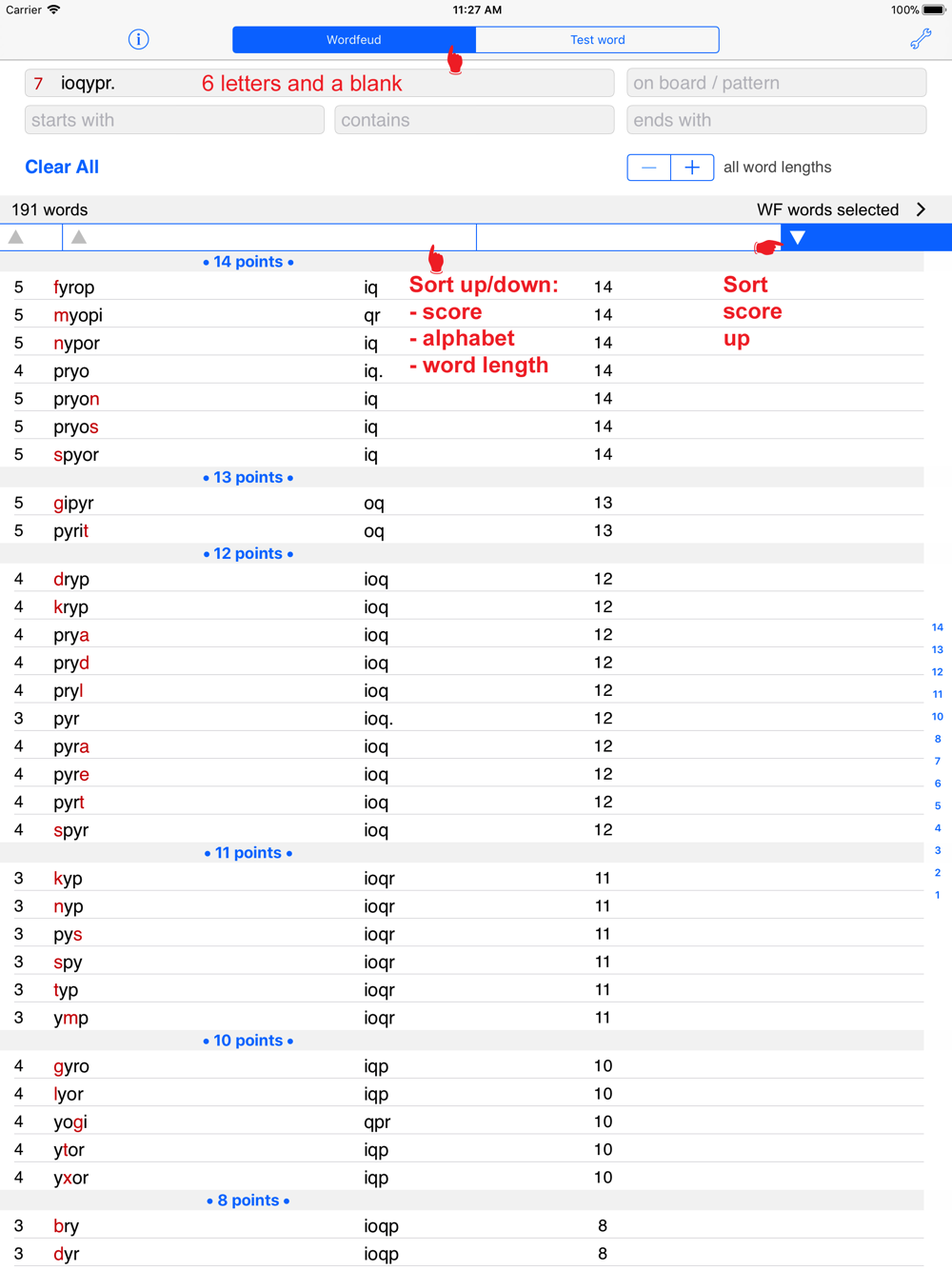 Finds words for playing the game, or to learn words you never knew. Sort the results on word length, alphabet, or word score. Find not the longest, but the best word! You can find words using the letters you have, but also match up letters and word parts on the board.