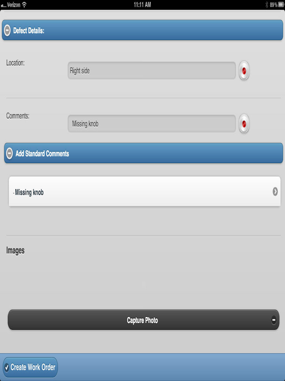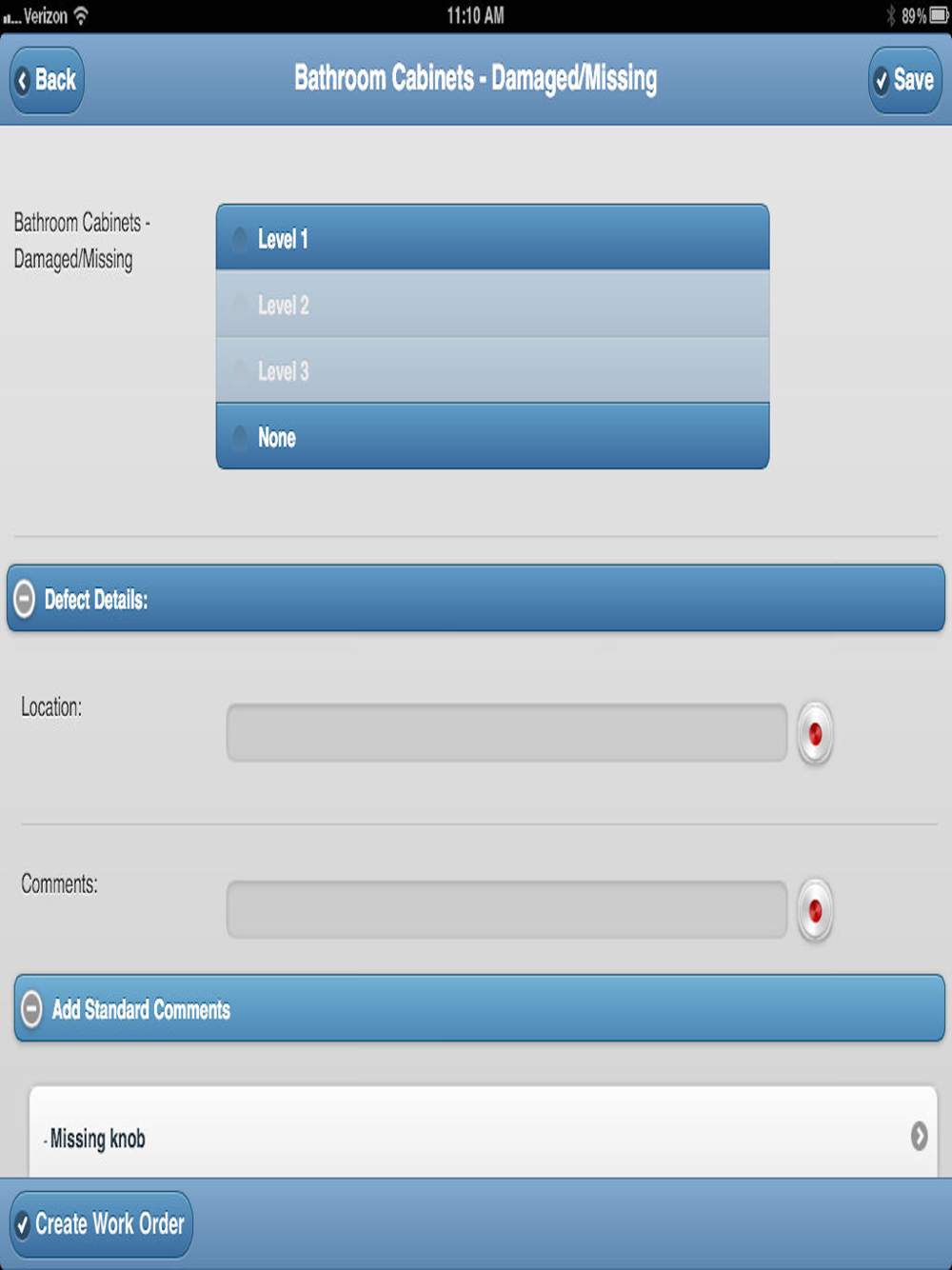 When deficiencies are noted the system has a Work Order creator that adds a work order for maintenance staff to the iMultifamily Work Order System and synchronizes to the maintenance staff iPhone.
