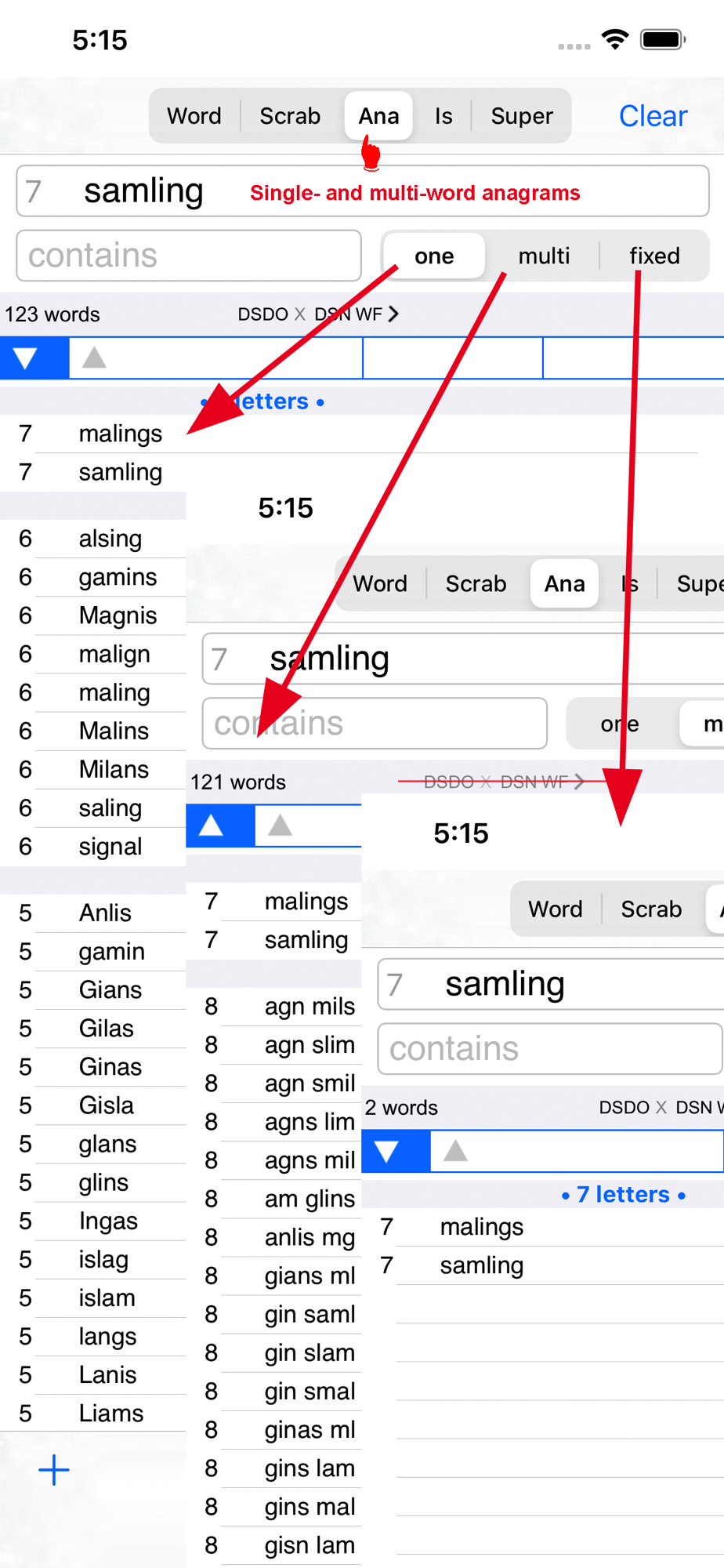 The anagram search is extended to find single- and multi-word anagrams, and search for more words in the remaining letters. Share your anagrams with Twitter and e-mail!