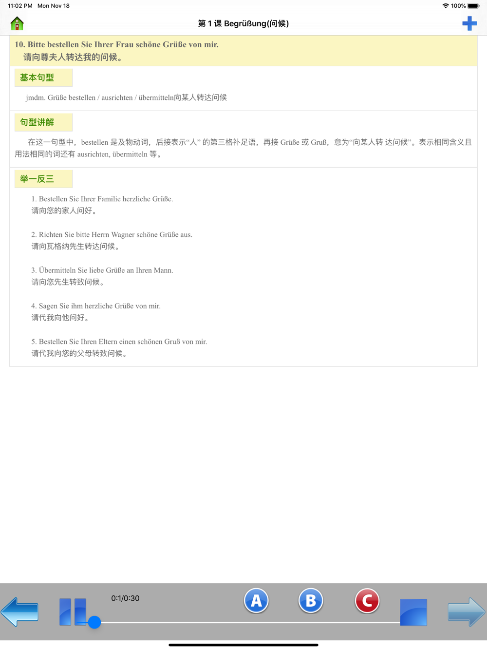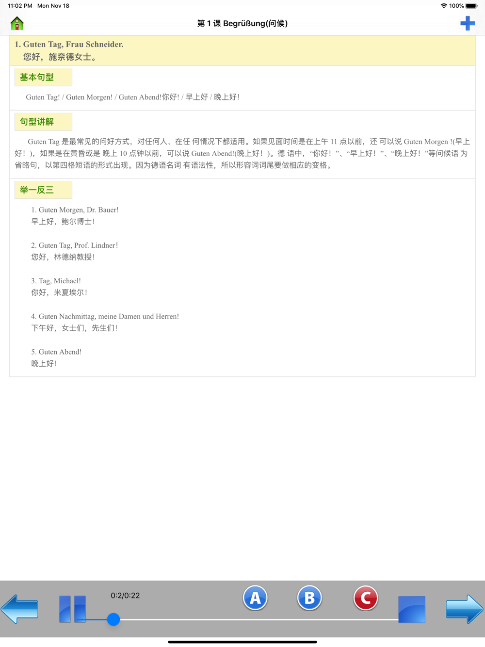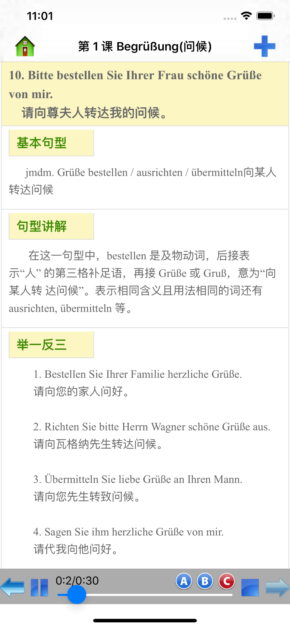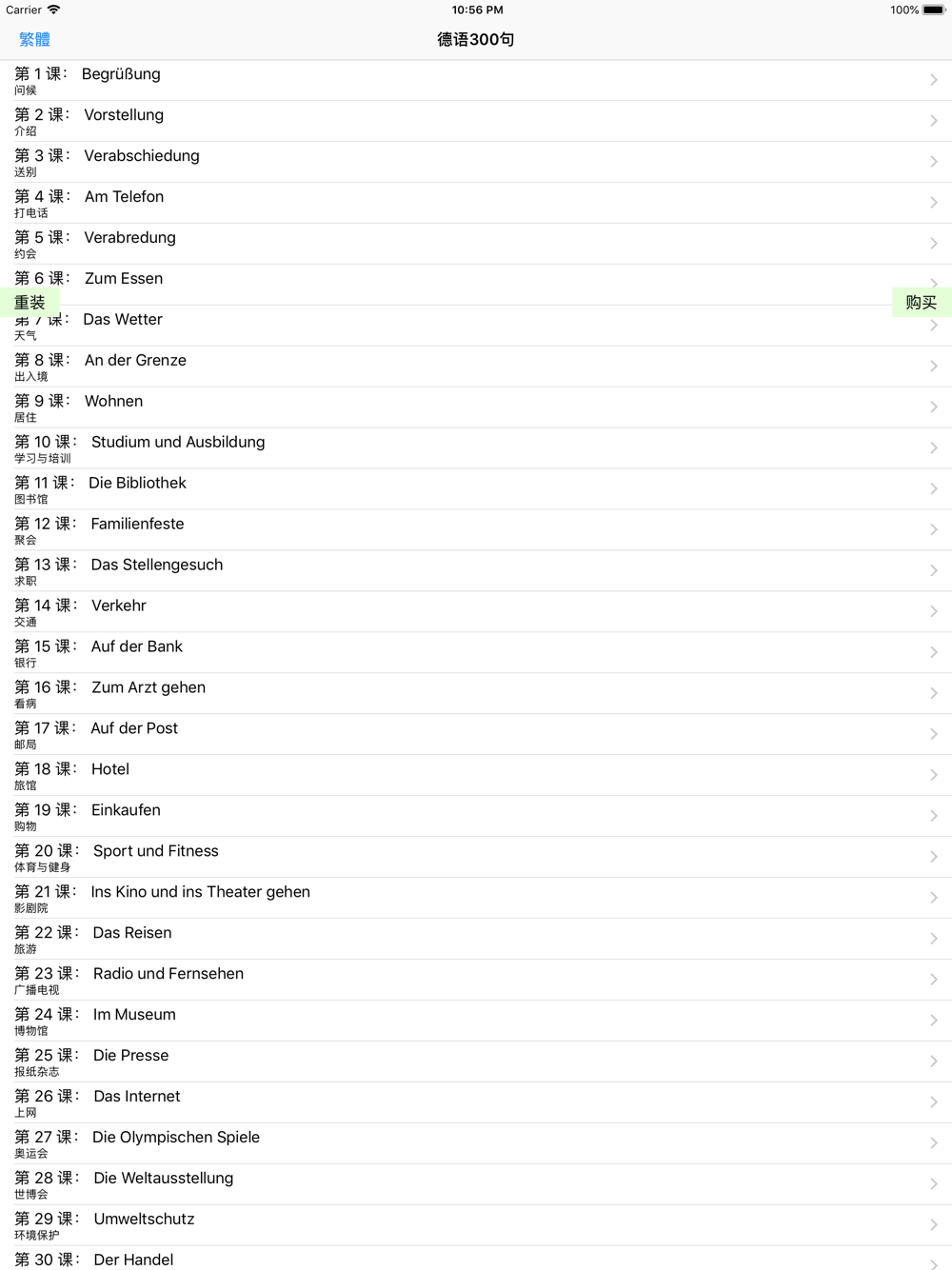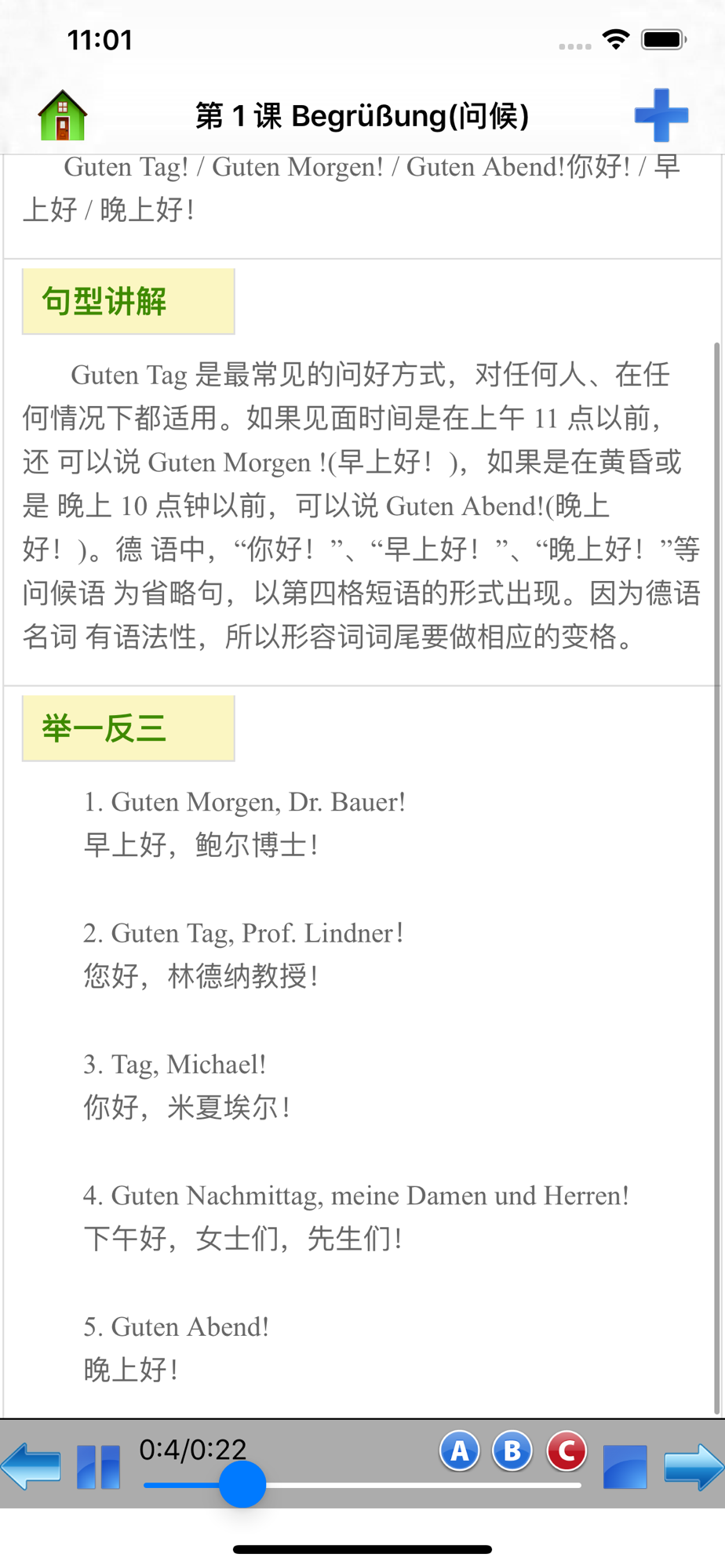 德语300句内容丰富生动、实用性强, 从语言、文化、思维模式三个层面向读者提供了极有价值的信息, 能迅速提高您的口语水平。该应用共有30单元, 每单元有10句组成, 每单元包括一个“文化常识”。每句话包含“基本句型”、“句型讲解”、“举一反三”三部分组成的,免费版前两单元含有清晰语音。是用户学习德语或练习德语的好帮手。