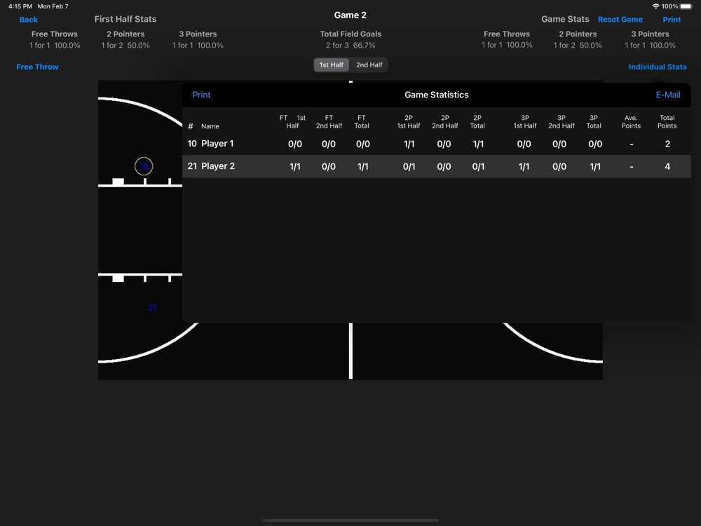 Stats for games and season may be printed, as well as a print screen to print the shot chart! Stats may also be emailed in a .csv file that can be opened from any spreadsheet application.
