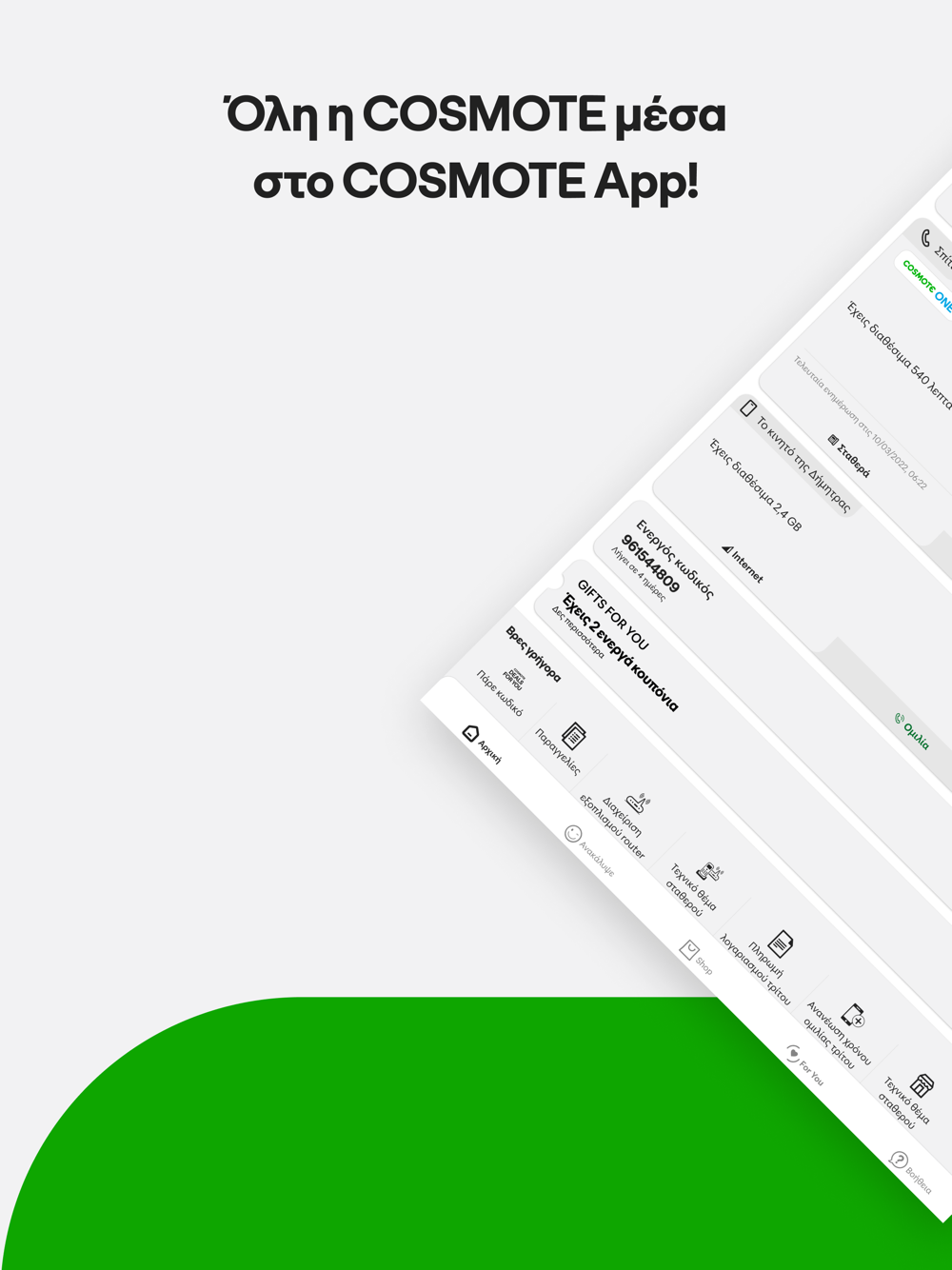 Πακέτα, υπηρεσίες, νέα προγράμματα και προσφορές για κάθε μία σύνδεση σου - κινητή, σταθερό και TV. Επιπλέον, μπορείς να αποκτήσεις COSMOTE TV, για να απολαμβάνεις το αγαπημένο σου πρόγραμμα, τη στιγμή που θές, χωρίς καμία δέσμευση
