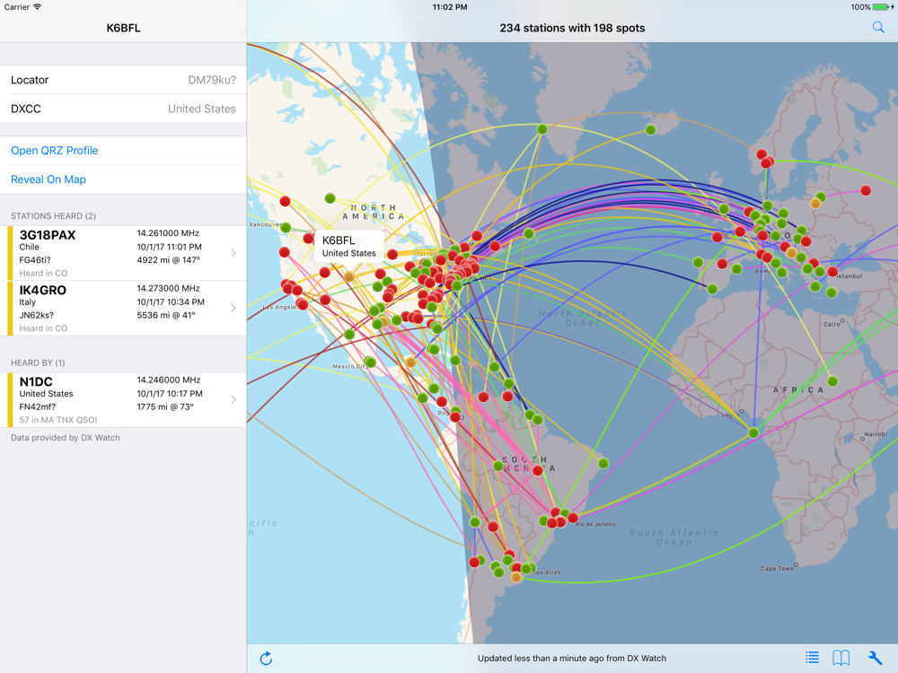 Utilizing data from popular DX clusters like PSK Reporter, DX Watch, Reverse Beacon Network, and WSPRnet, WaveGuide plots real-time propagation conditions on a global map, connecting stations with great circles to show exactly where band conditions are best. The colors of the great circles indicate the band, so it's easy to visually determine how the ionosphere is behaving anywhere in the world.