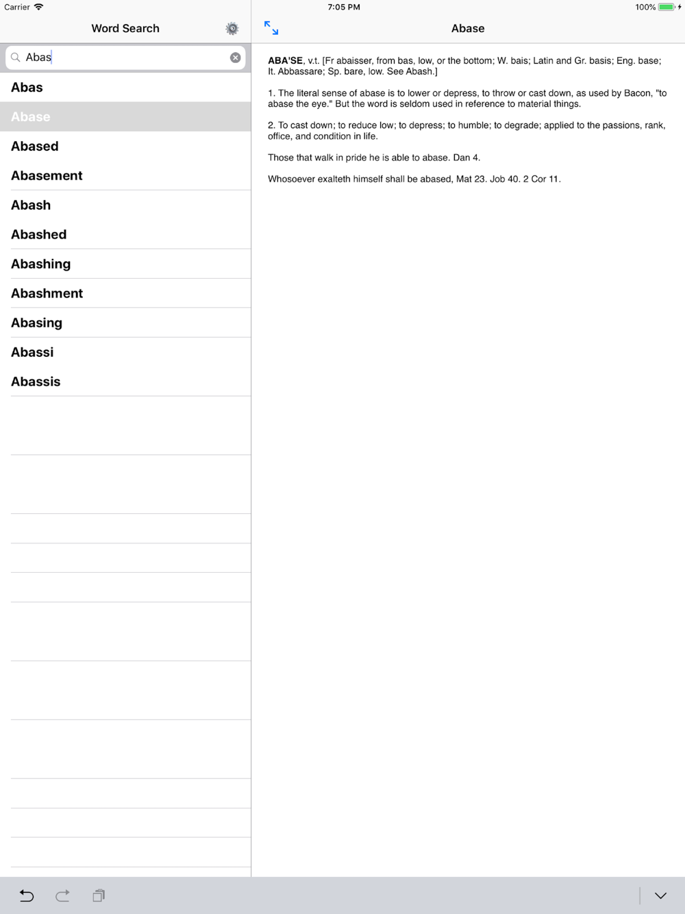1. Dictionary Cross-Reference. This upgrade provides tappable links to words referred to in some definitions. For example, the definition of Abase has a reference indicating "See Abash". With this upgrade, the referenced word will appear in blue and tapping the word will open the definition for that word.