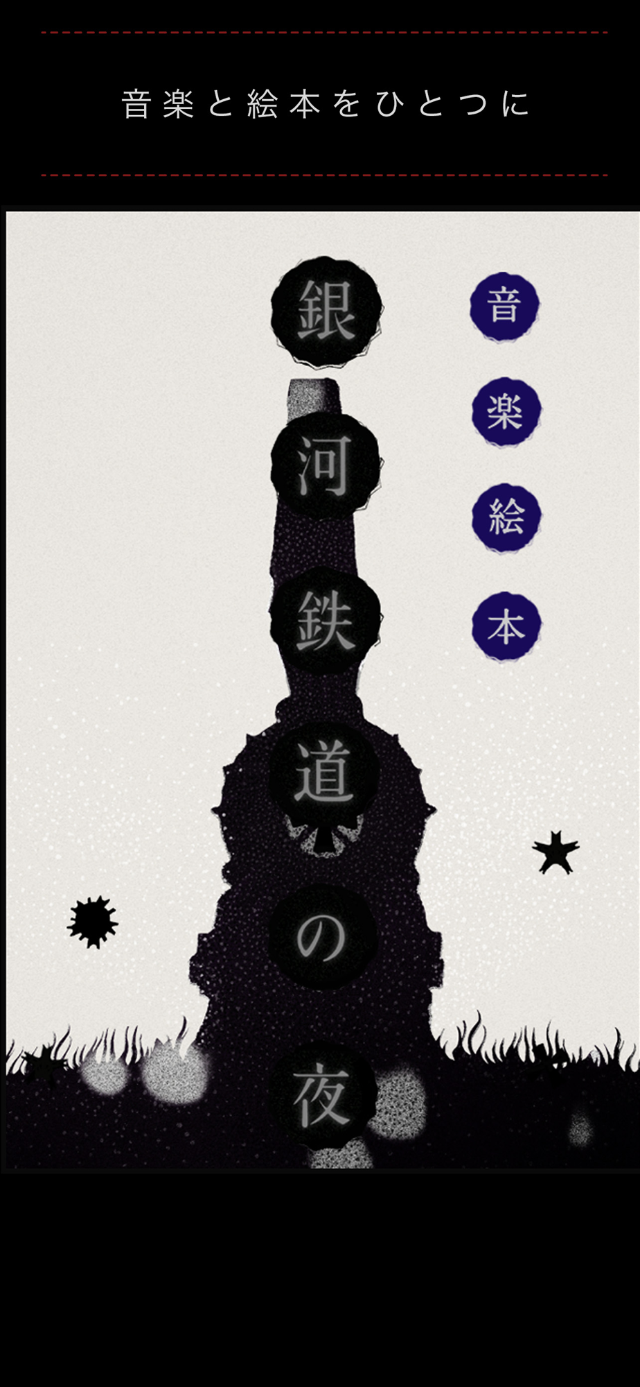 音楽と絵本をひとつに。不朽の名作、銀河鉄道の夜が、大人も楽しめる音楽絵本になりました。音楽絵本は、良質な音楽が付いた絵本です。美しいグラフィックと、15曲のトイトロニカな音楽が、映画を観ているような新しい読書体験にご案内いたします。部屋の明かりを消してヘッドホンやイヤホンでご覧頂きますと、より豊かな音楽絵本体験をお楽しみ頂けます。