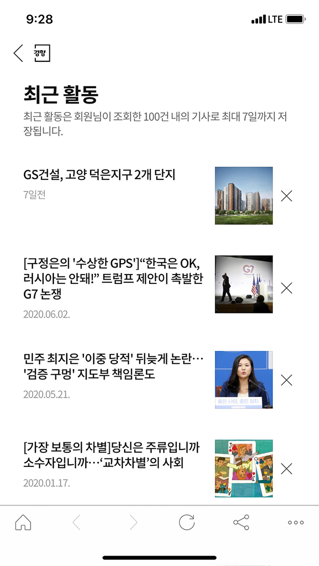 - 마이페이지에서 최근활동을 확인해보세요. 경향신문에서 읽은 기사의 이력을 확인할 수 있습니다.