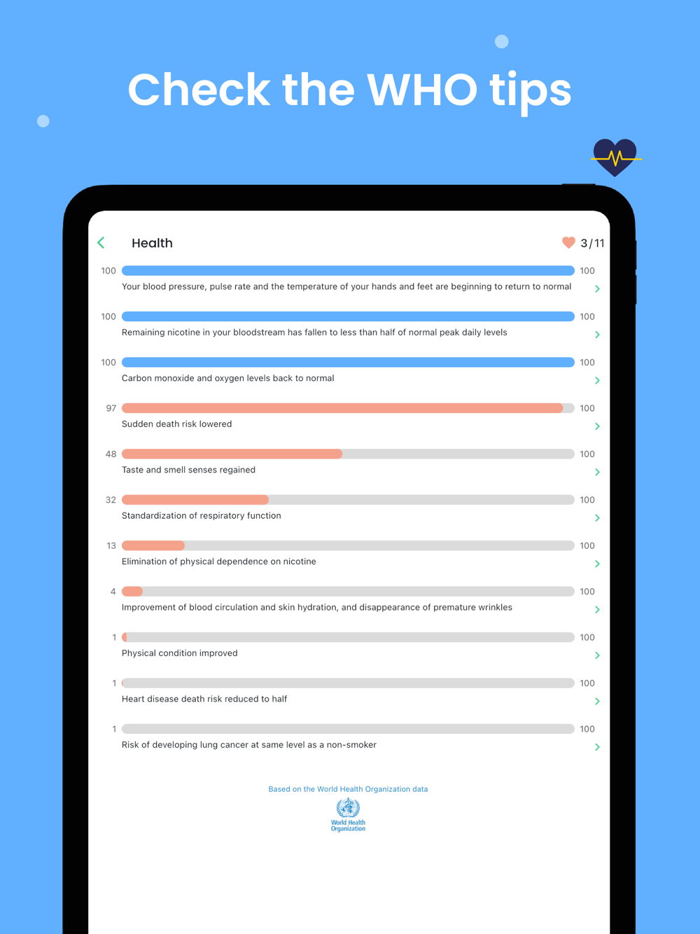 - Your ex-smoker health: QuitNow offers a list of health indicators to explain how your body improves day by day. They are based in the World Health Organization ones, and we update them as soon as the W.H.O. does.