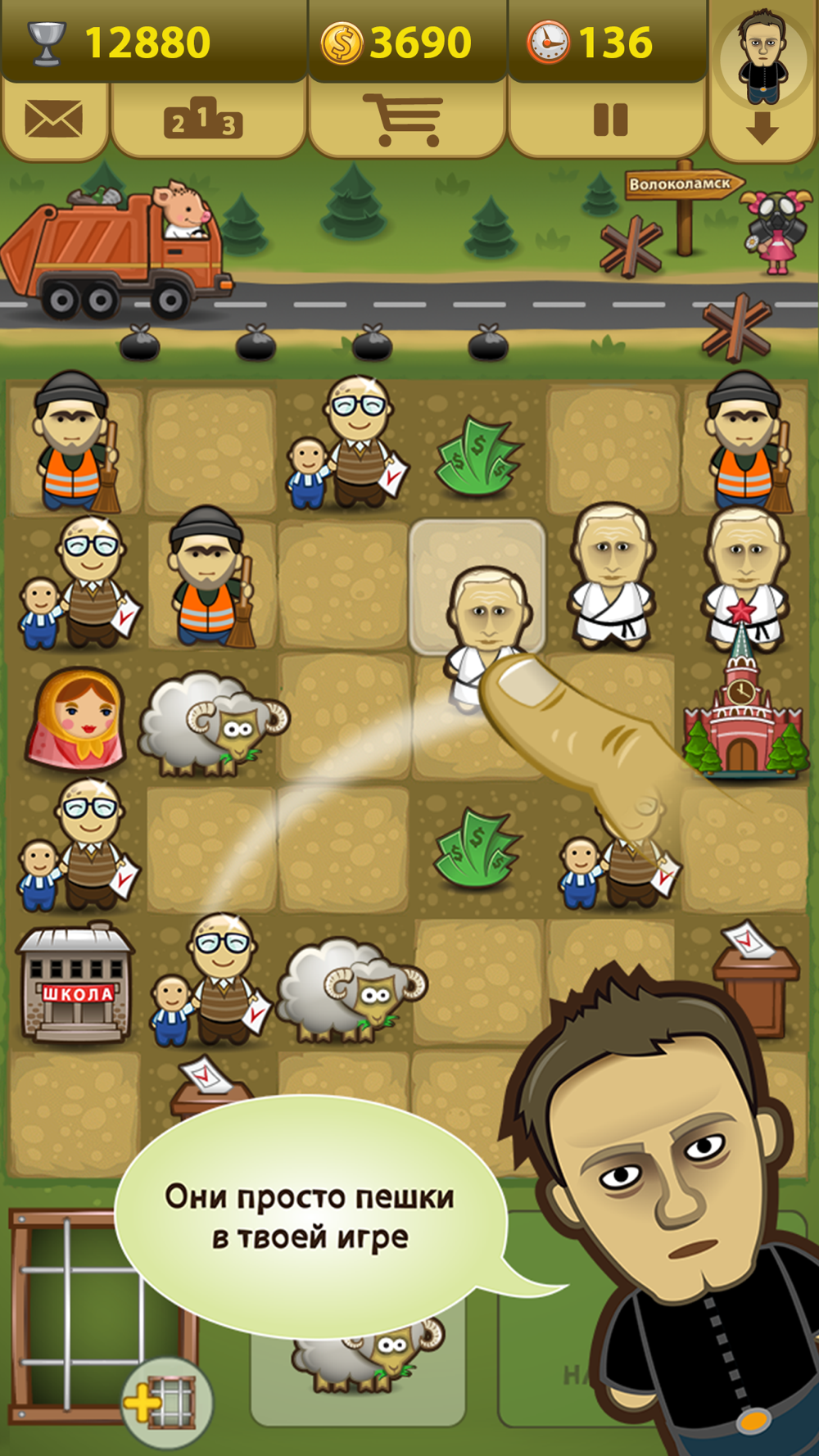Цель игры проста – расставить все объекты на поле, мутировать их дальше и дальше. Три и более одинаковых фигурки рядом превращаются в новую фигурку. Депутаты – в Думу, Министры – в Правительство, и так далее. Каждый ход появляются новые фигурки, продолжай собирать их по три, продержись дольше всех, дойди до Премьера и Президента... а дальше вообще начинается такое, что ух!