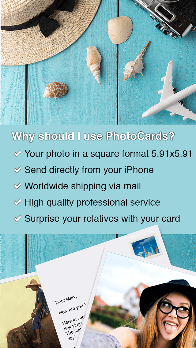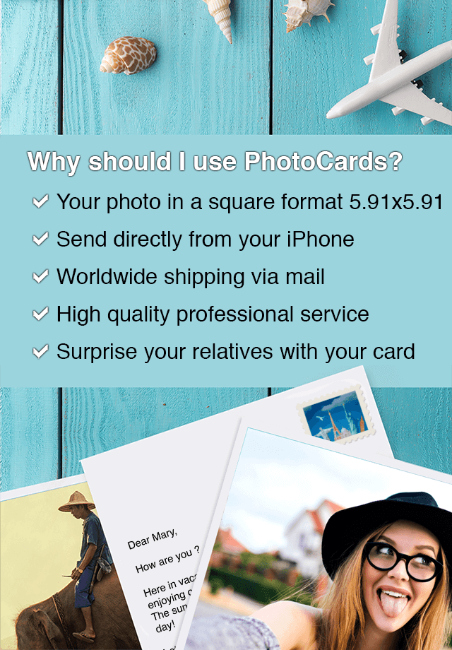 You forgot to send your postcards during your holidays? Don't worry, in a few clicks send your cards with PhotoCards and don't bother anymore with the stamps !