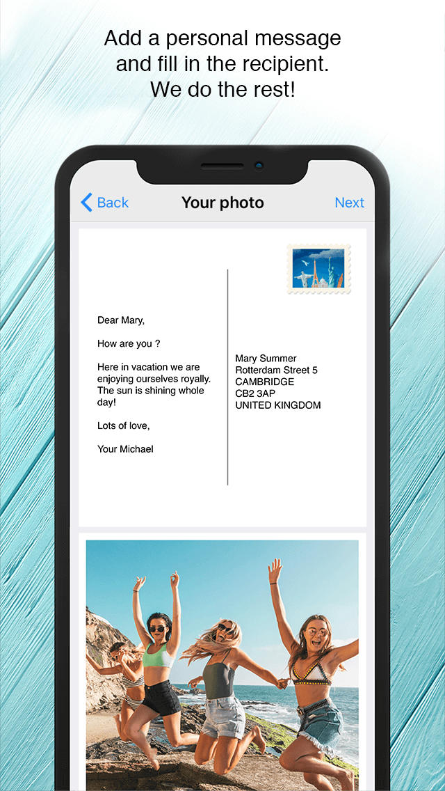 Import your best photo creations into the app, add your message and the recipient's details, and we'll take care of the rest.