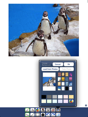 The Background Tool let's you choose your Background from set or custom Colors, in-App Images, Imported Images from your Photo Roll, or Photos taken right in the App!