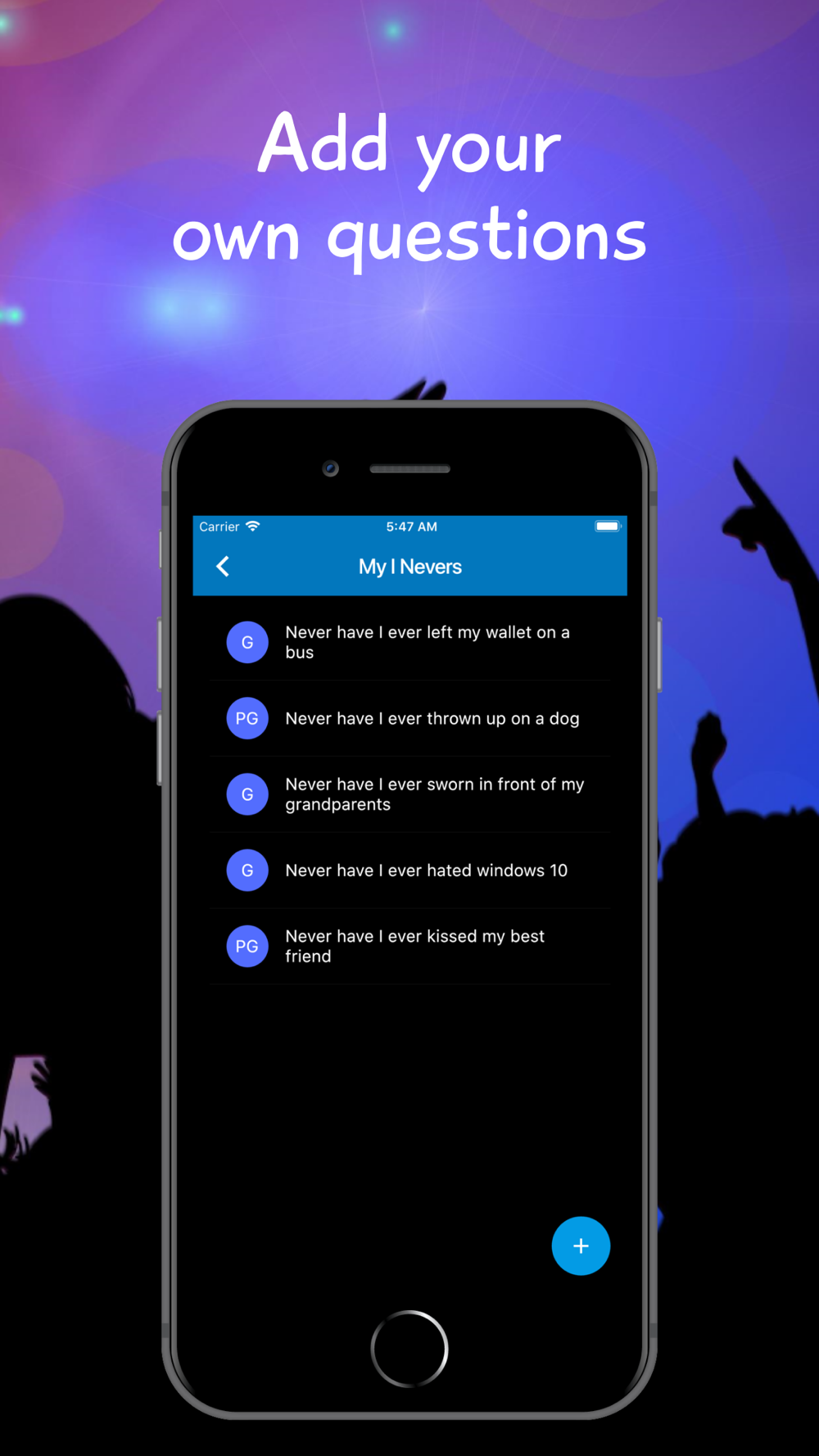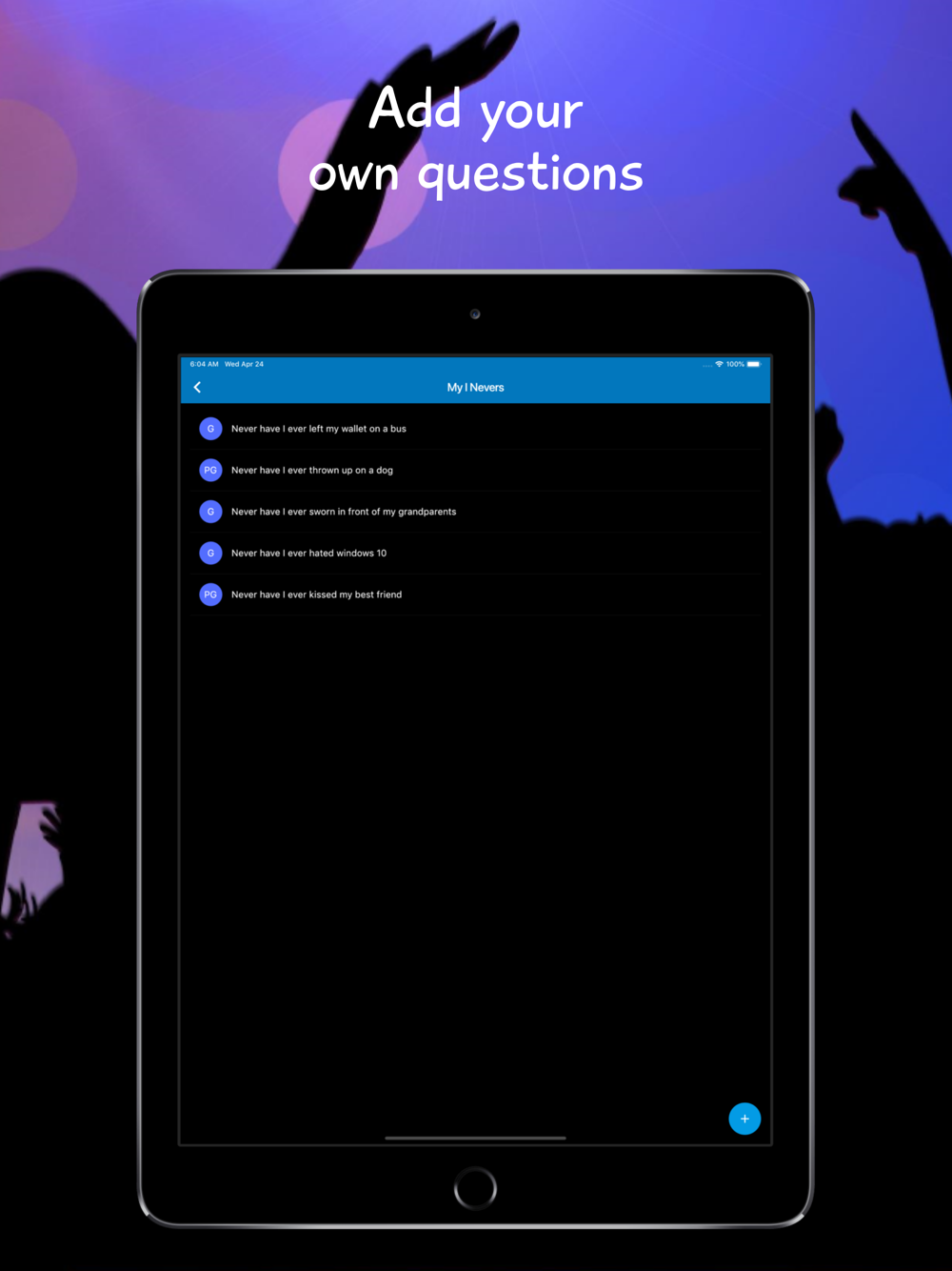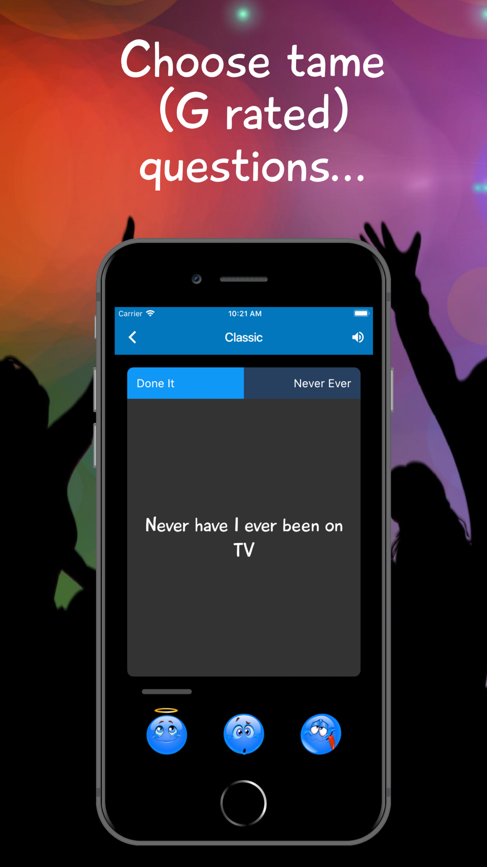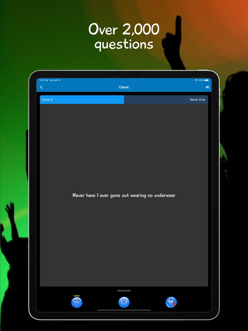 - Over 2,000 Never Have I Ever questions, new questions are automatically downloaded from ineverparty.com.