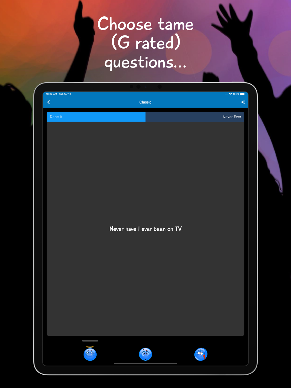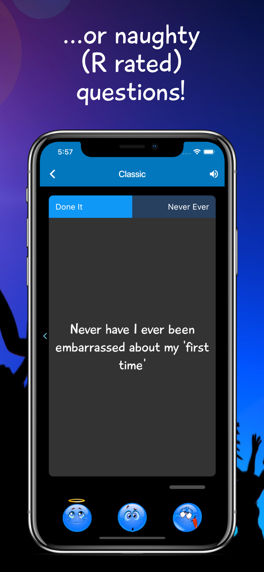 The app contains over 2,000 questions: tame, sexy, clean, dirty, wild, flirty and crazy I Never questions. Play the Classic version or choose a themed question pack for a special occasion (e.g. Festival, Girls Night, For Singles, For Couples, After Party...).