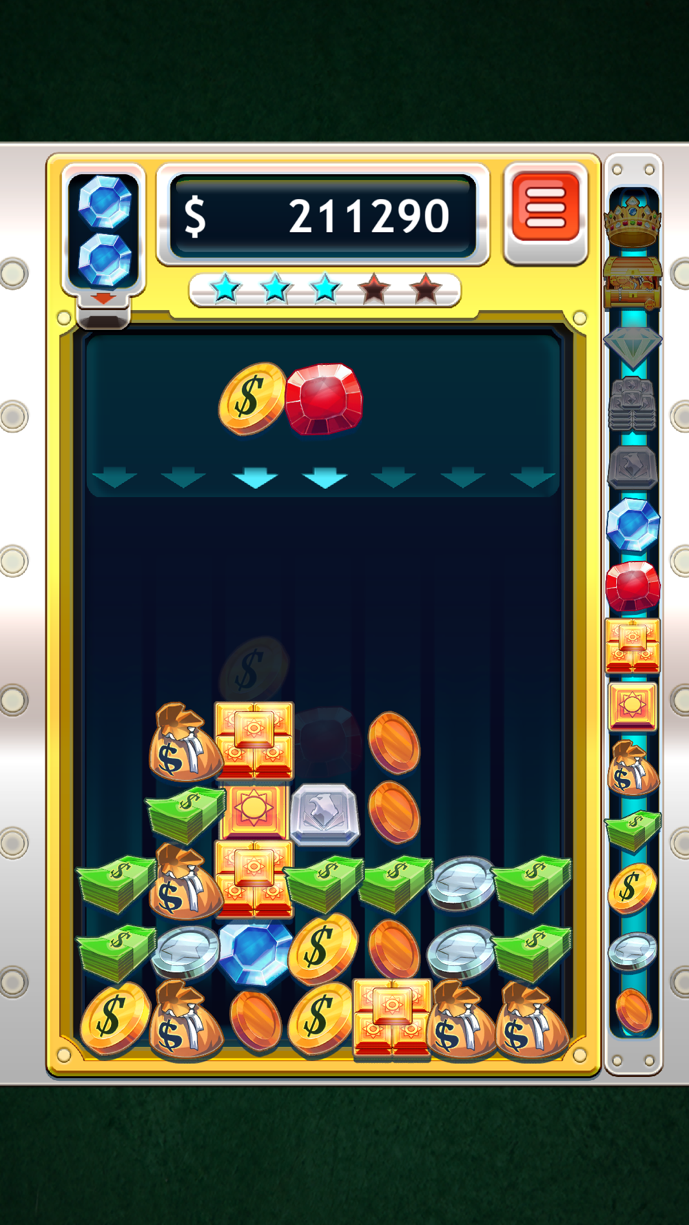 Например, если вы соедините три серебряных монеты, они превратятся в одну золотую. Если сложить три золотые монеты, они превратятся в банкноту и так далее. Таким образом, чем больше вы продвигаетесь в игре, тем больше увеличивается количество различных объектов в игре.