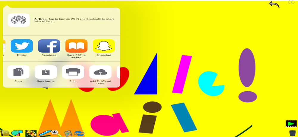 Share dialog (for exporting to social media including Facebook, Twitter, Snapchat, iMessage, photo album, printers, and others). Invoked by selecting "share" after pressing the clipboard button at bottom of screen.