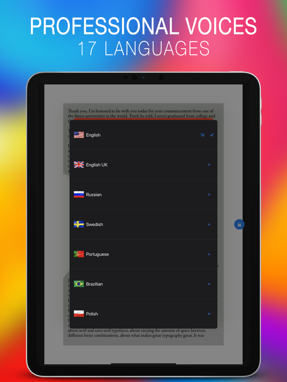 The cutting edge vBookz PDF Voice Reader has an advanced text-to-speech high quality voices with 17 languages. It's the best way to follow and read documents on iPad, iPhone or iPod. vBookz adds orientation and navigation tools that enhance the reading experience.