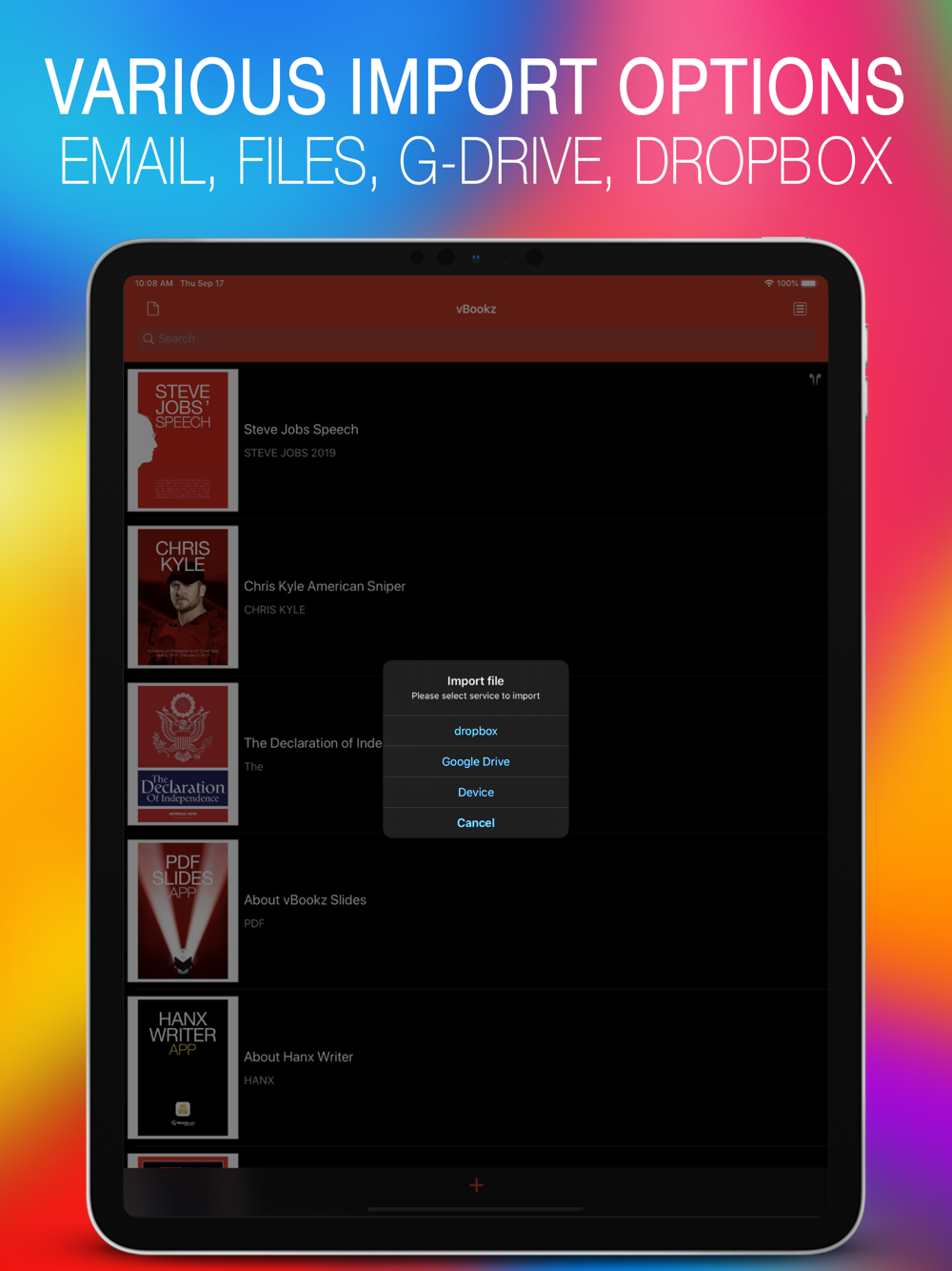 vBookz reads PDF files out loud, from 'Dropbox', 'G-Drive' and 'iOS Files'.