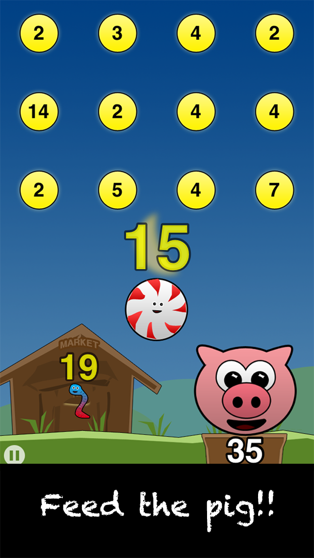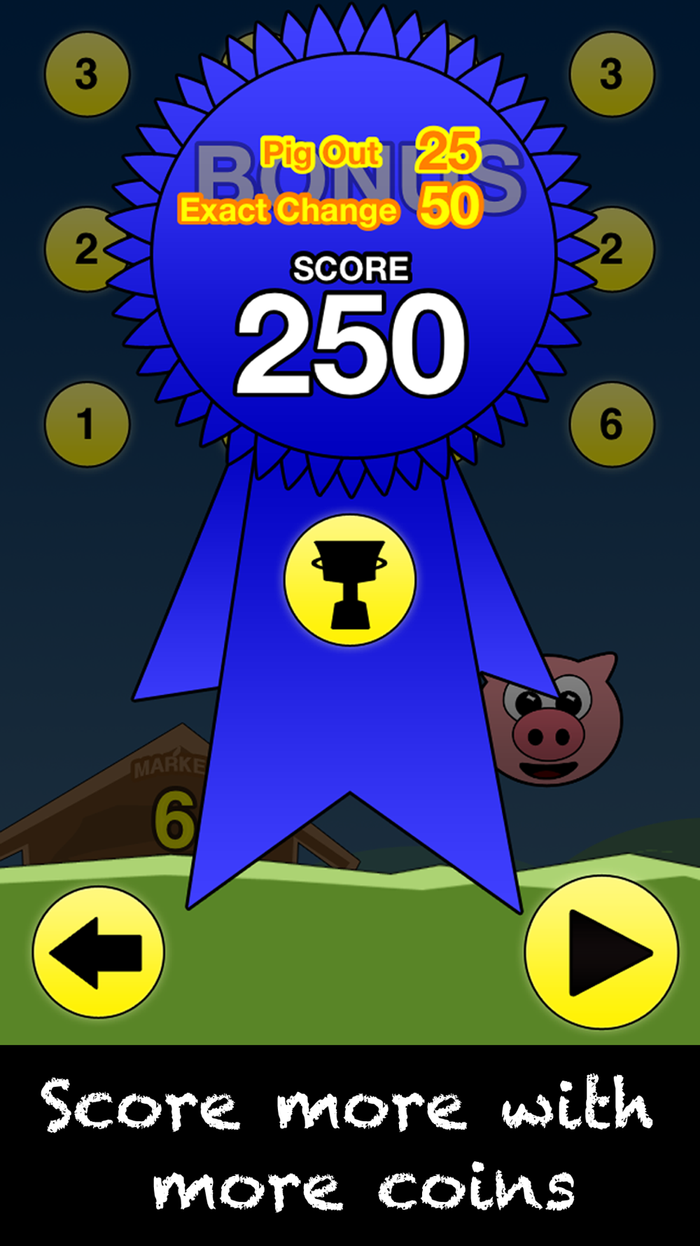 Choose a pig and pick a meal. Then add up your coins to buy food from the market and watch your pig grow. You have from sunrise until the moon goes down to feed your pig and earn your ribbon. Use as many coins as possible to make each number and score bigger! Make your BIG PIG BONUS count!