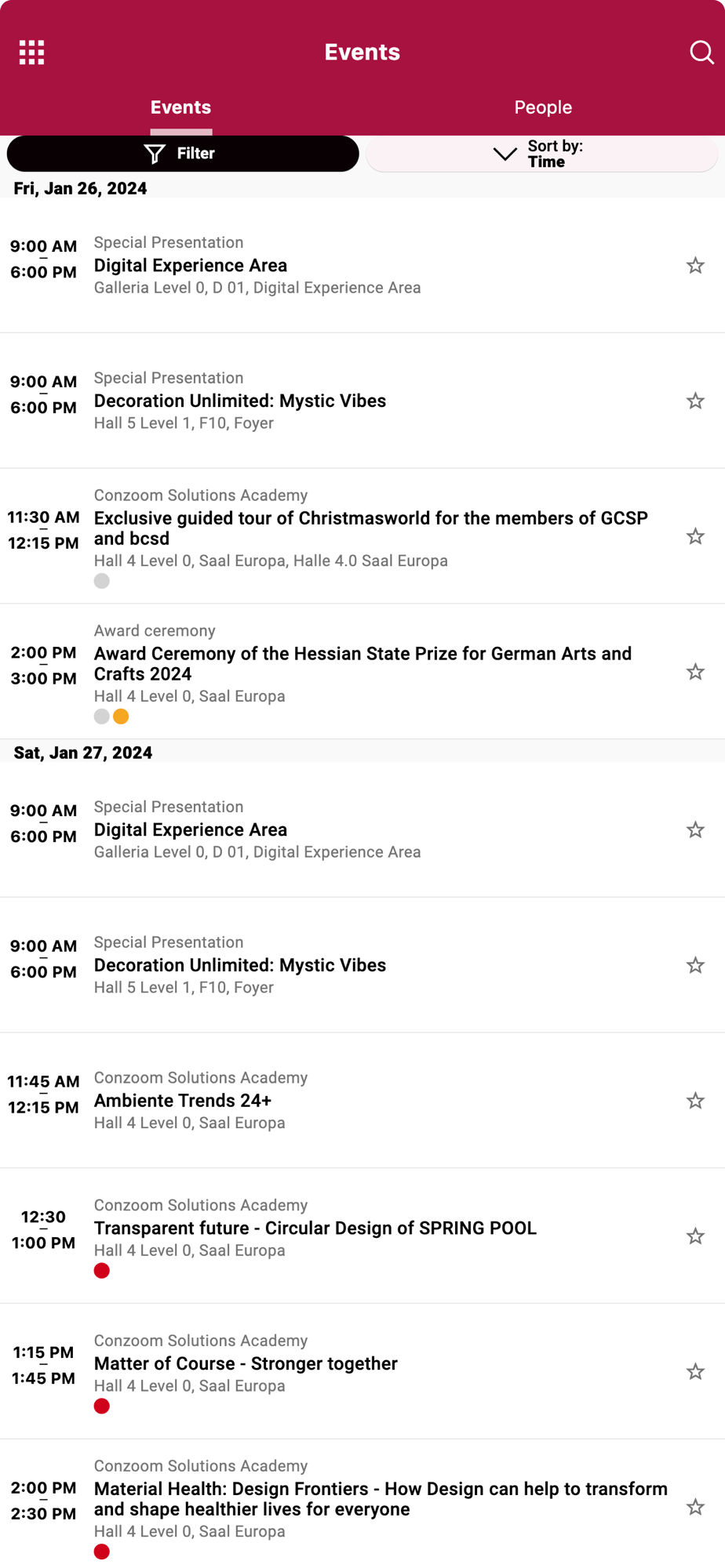 Exhibitors: search for companies and products, filter and sort functions available, also find contact persons ad exhibitor events. Add Photos and Notes to an exhibitor and share them.
