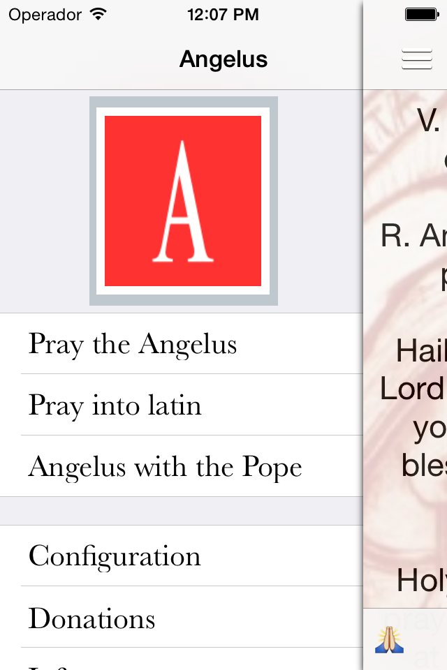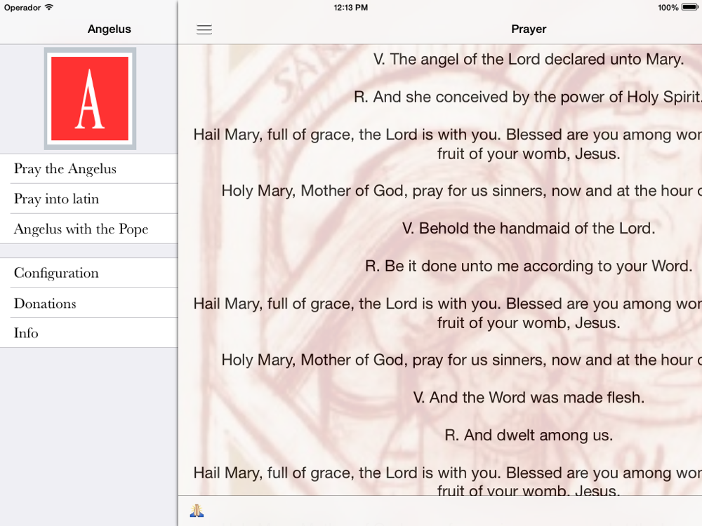 This application allows the Angelus prayer in both your language and Latin. Furthermore, the application notifies you at 12 PM to remind you when to pray the Angelus.