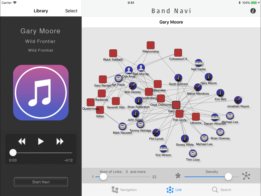 BandNavi HD enables you to find new bands and musics from relations between musicians.