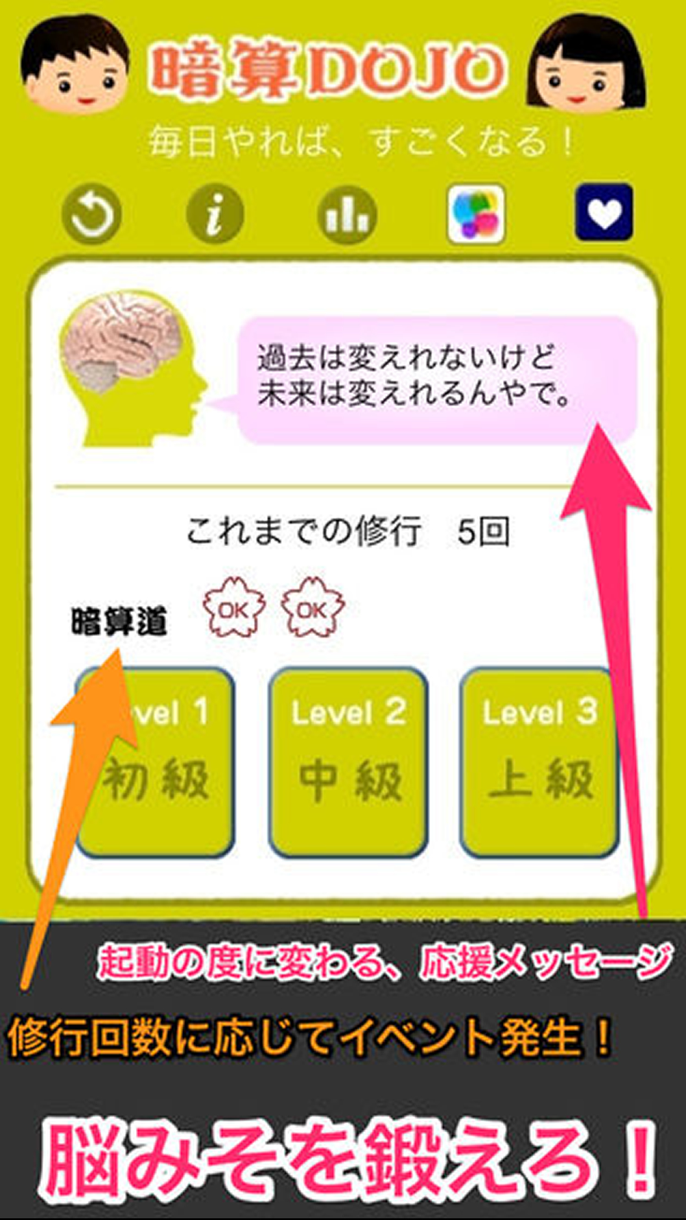 This application is to help players strengthen their abilities to do mental calculations with enjoyment. Players are to do math in their heads until they answer correctly 10 consecutive questions and they compete for the time spent to complete calculations.