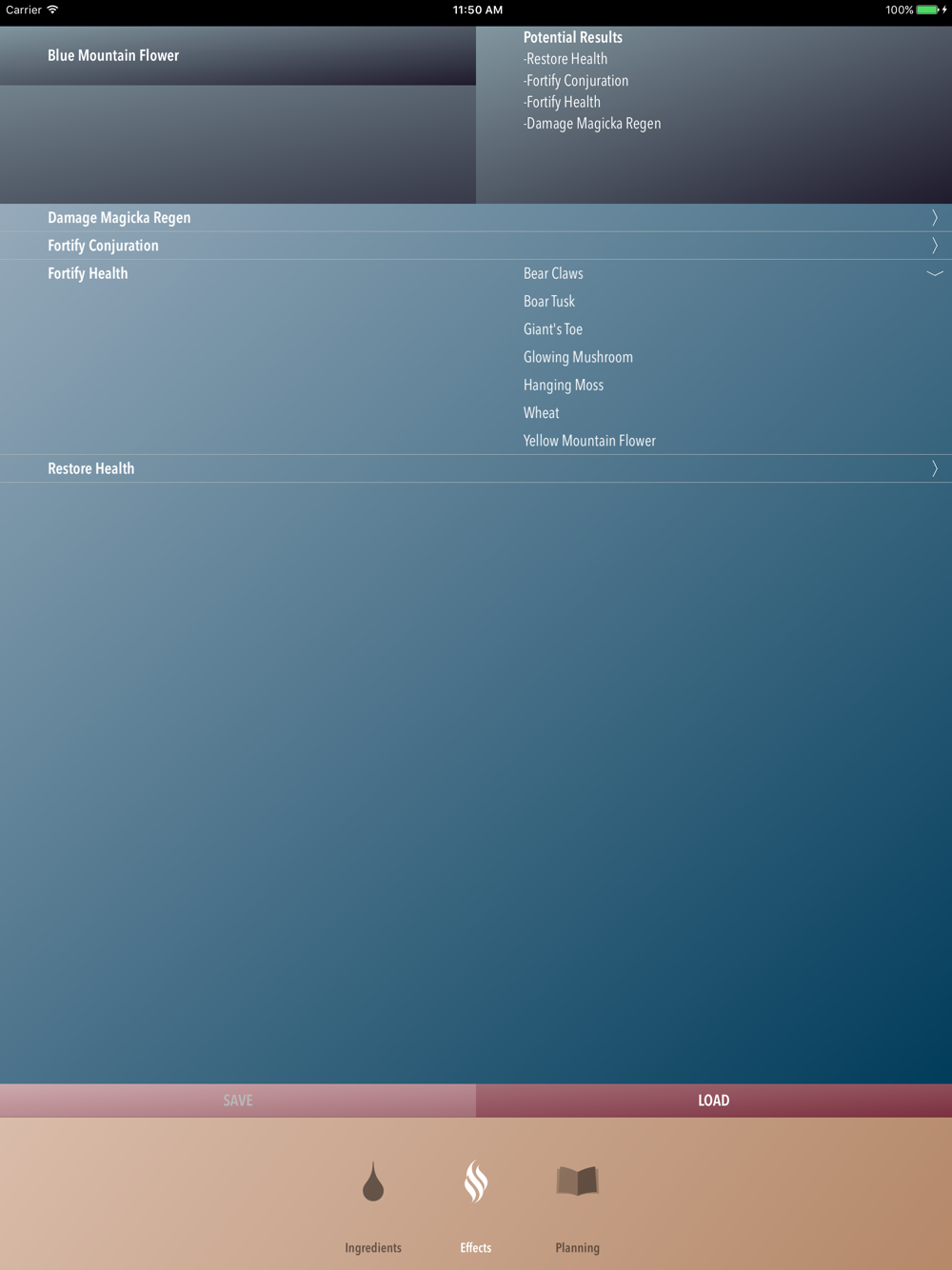 • Use the planner tab to select all the ingredients you have on hand and generate a database with all the possible potions made from those ingredients.