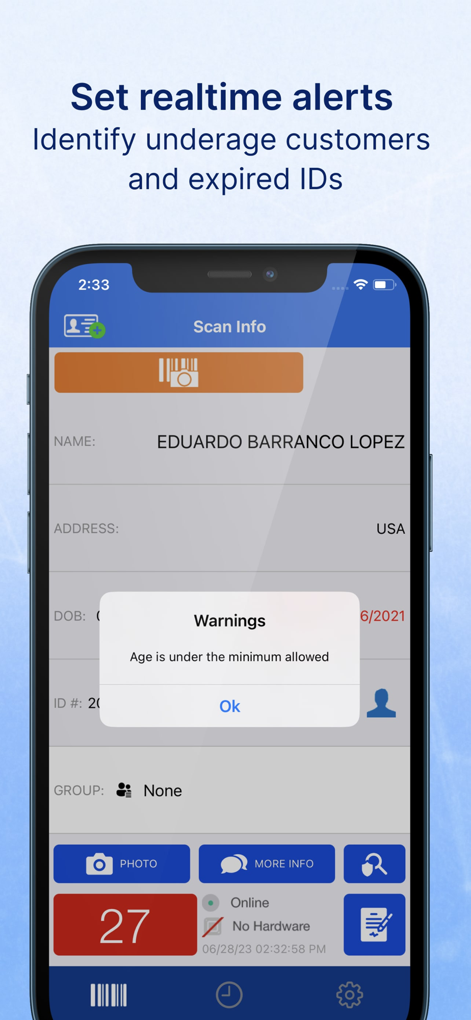 Just slide an ID (such as USA issued Driver's license or State ID) and you will see Name of the Person, DOB, Address, ID Expiration date, Age and assigned group (if any assigned).