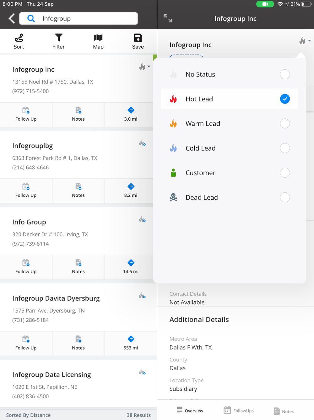 · Manage Your Prospects: Keep your contacts up-to-date by using notes, setting lead status or tags, and creating follow-ups on the go