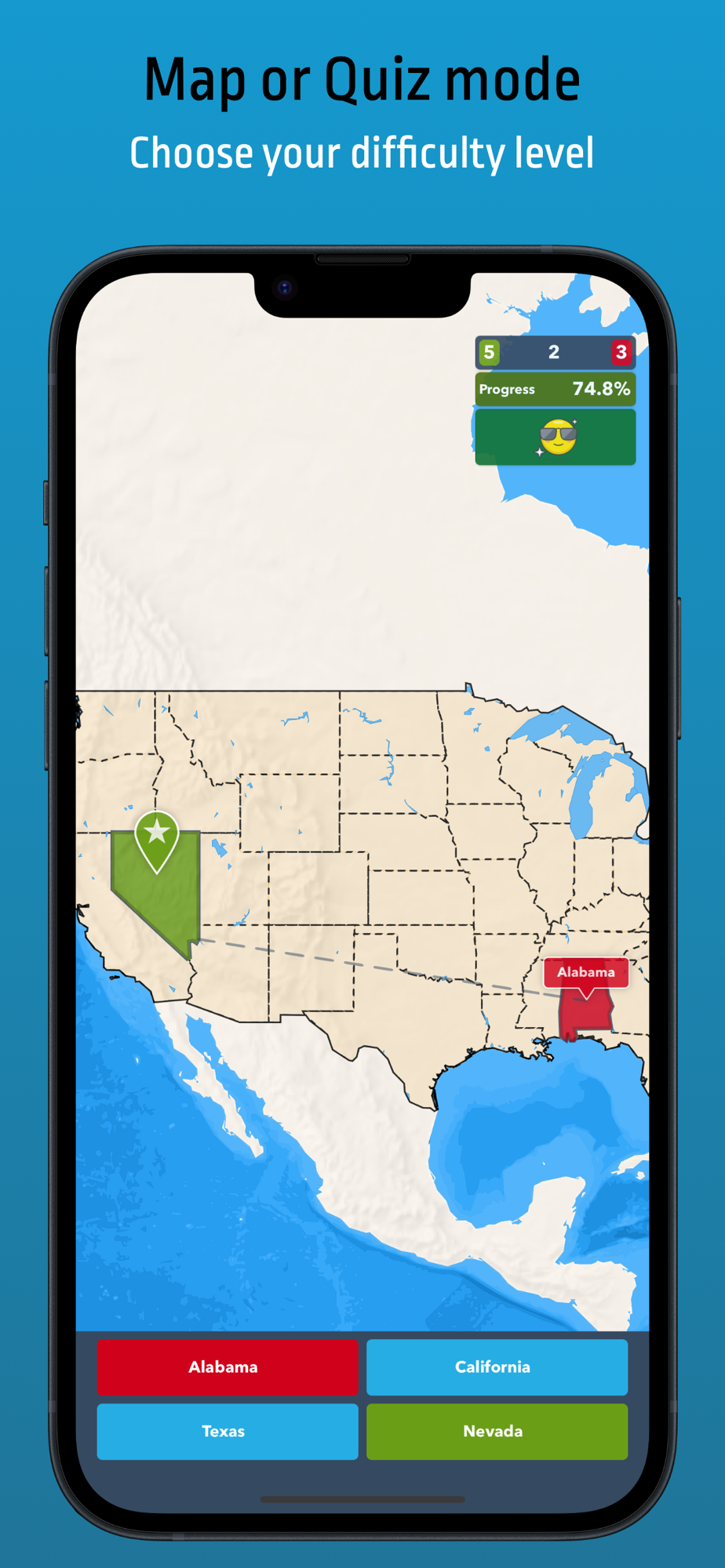 The ultimate geography quiz that helps you learn countries, US states (and other states), capitals, and landmarks in a fun and engaging game. With over 9 million downloads and counting, it's one of the most popular and trusted quiz games for mastering geography.