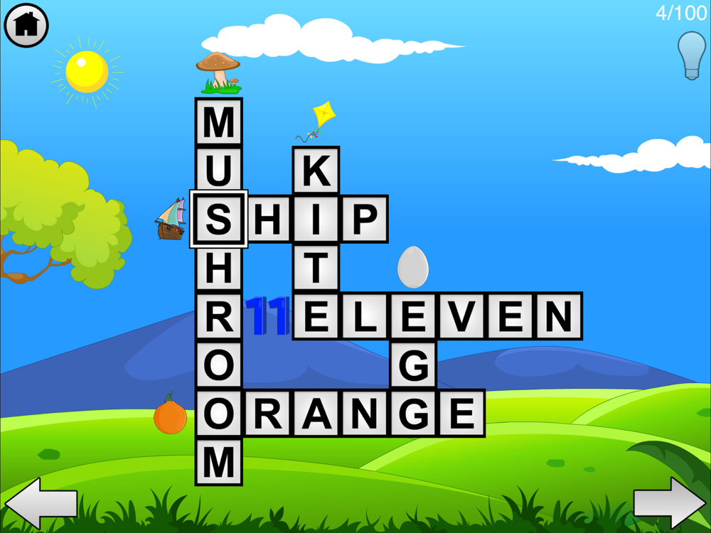 To solve a crossword, picture clues are provided for every word. On tapping the picture, the picture zooms in and its name is spoken aloud. The letters are scattered everywhere. The child has to drag each letter and spell a word correctly. Hints are available if needed.