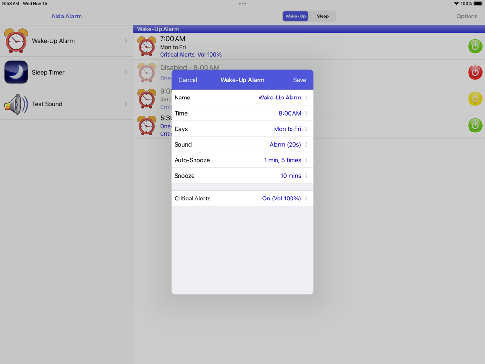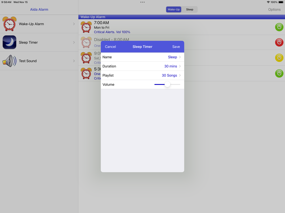 Aida Wake-Up Alarm has an Auto-Snooze feature to make sure you get up on time. You can pick a song from your music library to wake up gently every morning. It has a sleep timer so you can fall asleep pleasantly listening to your favorite songs.