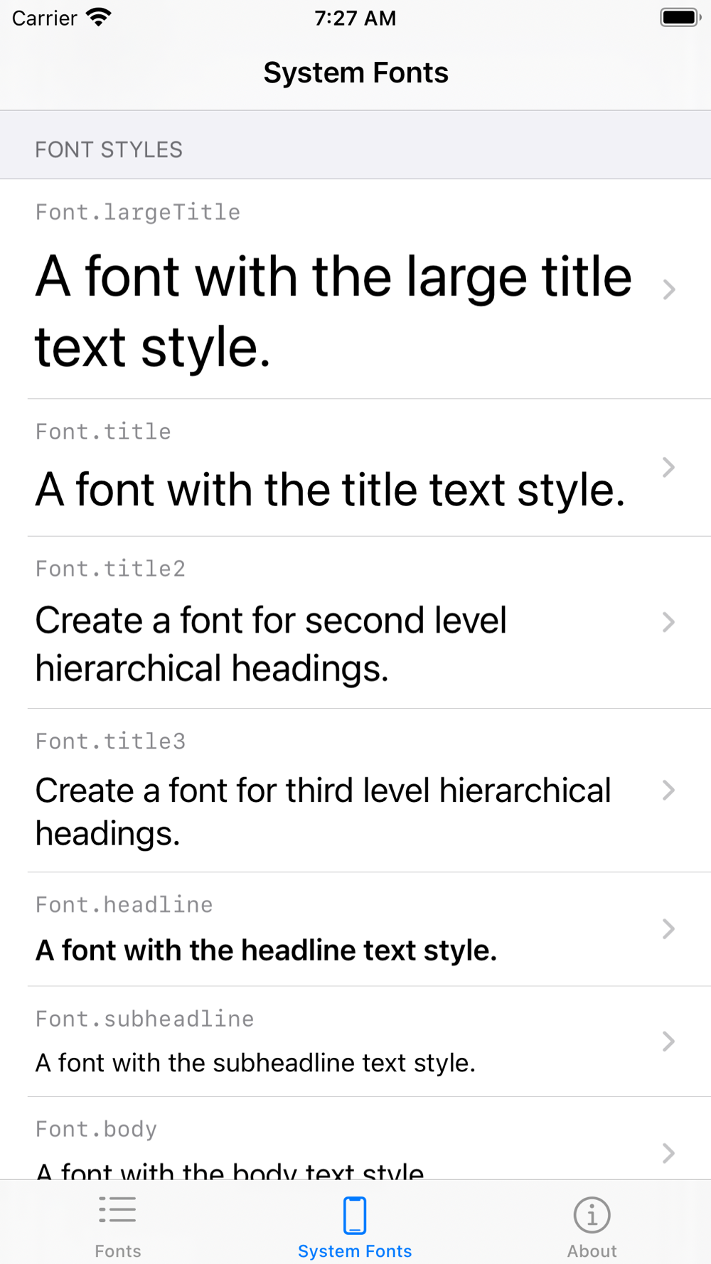 Font Browser lets you view all the font families and fonts available on your iPhone. This is especially useful if you are an iOS software developer or iOS app designer. Font Browser allows you to keep track of the ever-changing font families and fonts. Select any installed font and preview its appearance using editable sample text in multiple sizes.