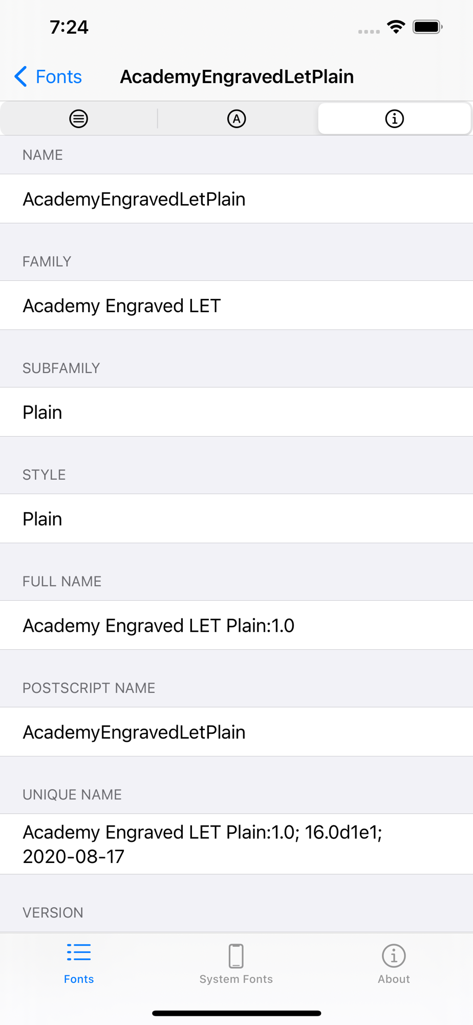 The app also displays additional information about the selected font like: Designer, Manufacturer, Copyright, Brand and much more.