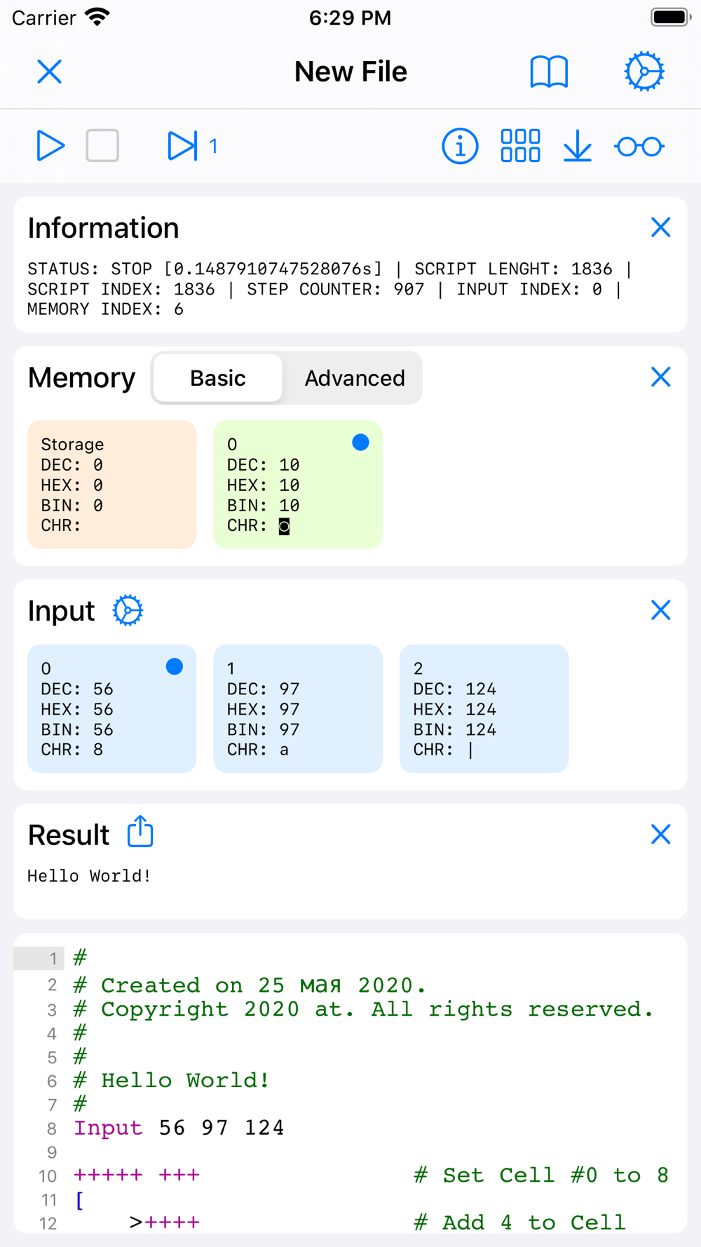 The language consists of eight commands, listed below. ABrainf*ck program is a sequence of these commands, possibly interspersed with other characters (which are ignored). The commands are executed sequentially, with some exceptions: an instruction pointer begins at the first command, and each command it points to is executed, after which it normally moves forward to the next command. The program terminates when the instruction pointer moves past the last command.