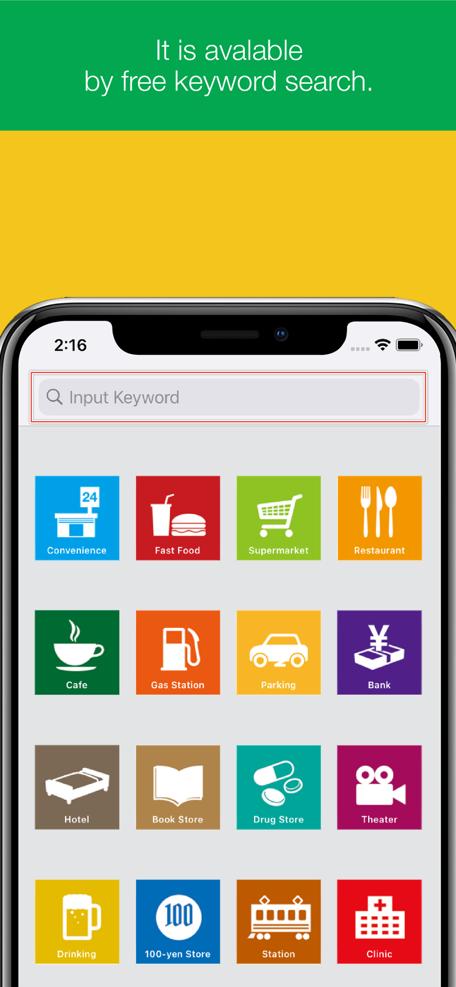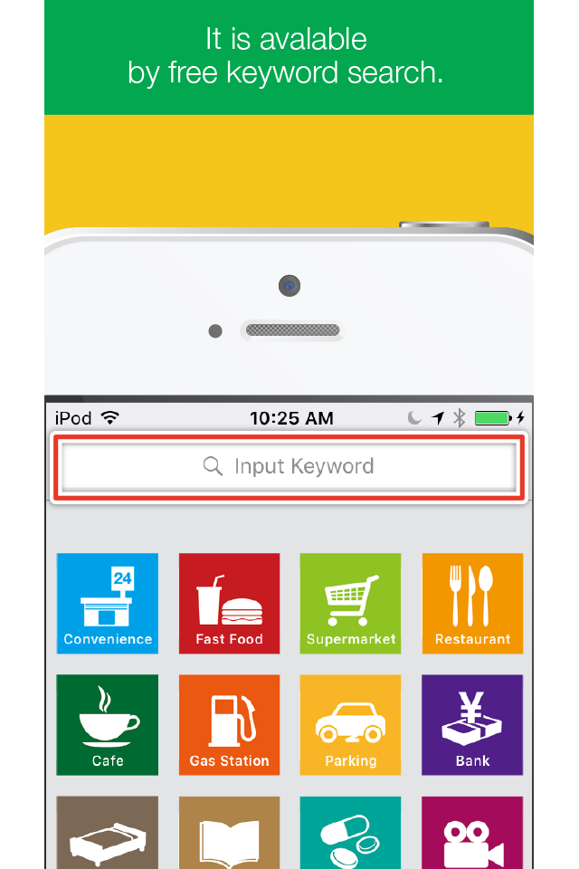 "Search Landmark" searches Landmarks or Shops around your place as center and shows their place on Map.