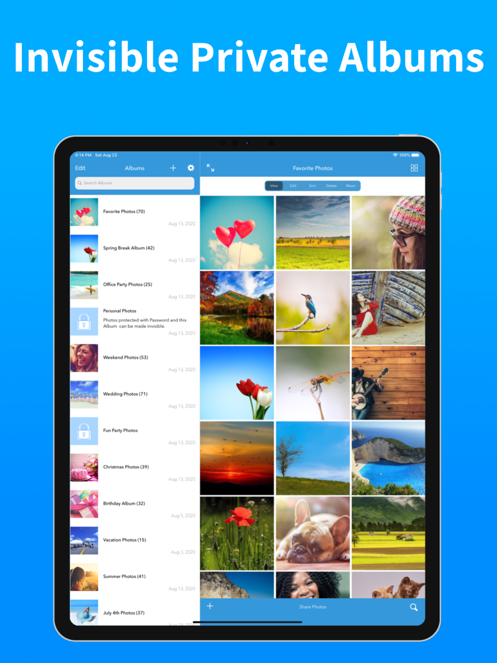 Photo Album is the best photo management solution to manage your photos and videos with strong Privacy features, lots of functionalities to Organize, create Slideshows and Sync your photos and videos between devices with iCloud and Dropbox.