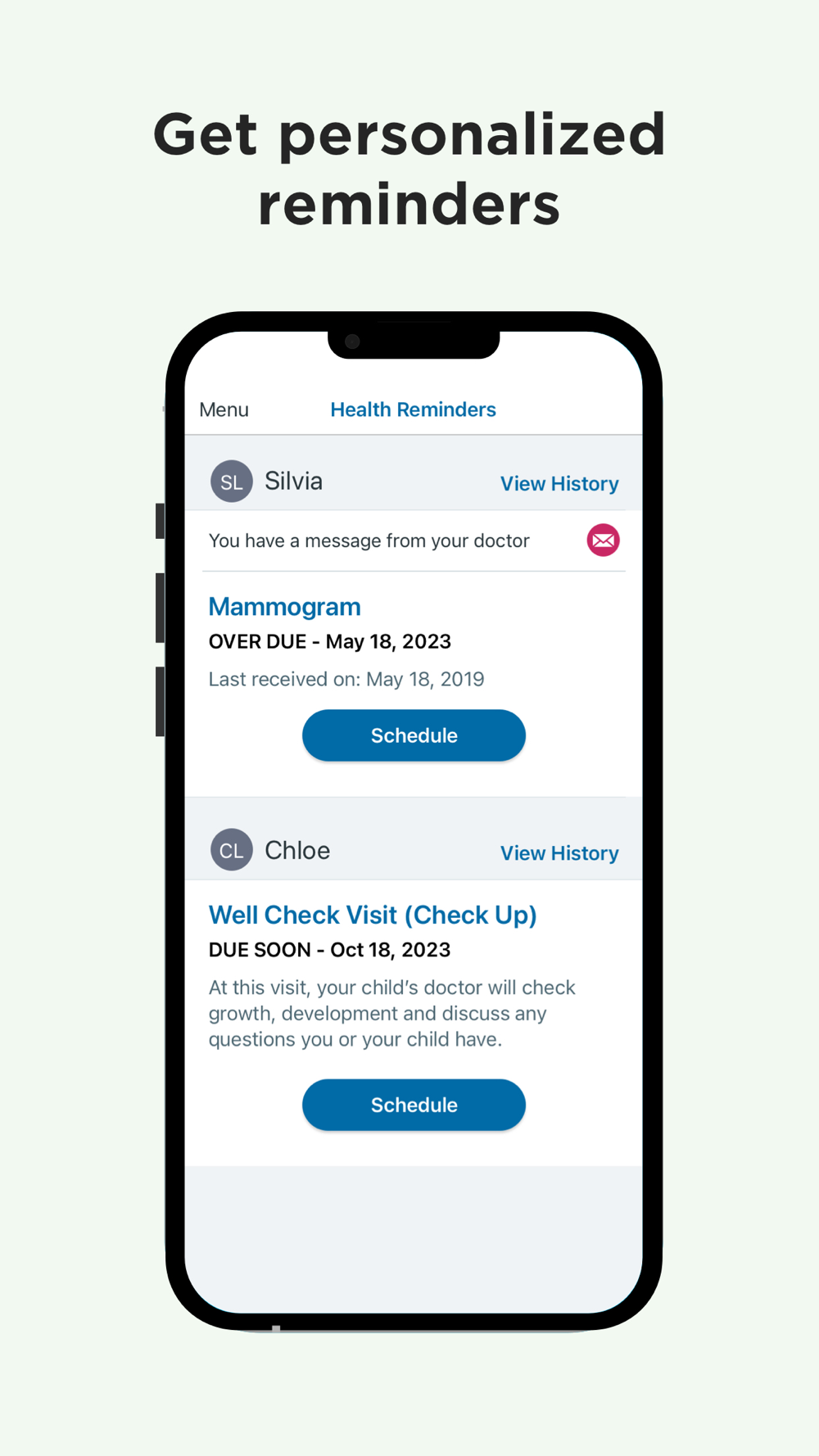 • Get timely notifications about appointments, screenings, immunizations, surgeries and procedures, pregnancy, diabetes, and more.